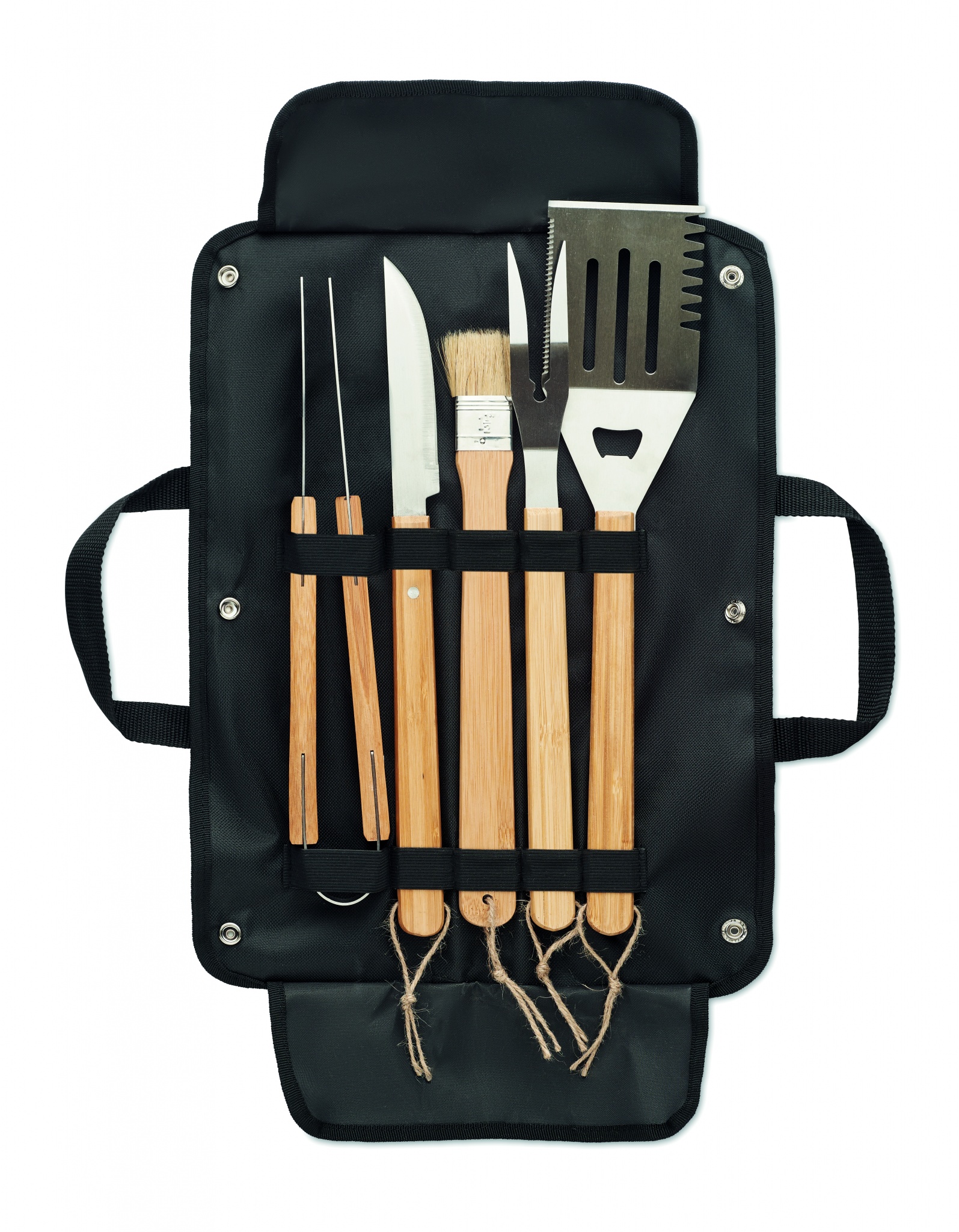 5teiliges BBQ-Set aus Edelstahl mit Griffen aus Holz. Inkl. Grillgabel, Grillzange, Pinsel, Messer und Wender. Verpackt in einer gewachstem Canvas Tasche.