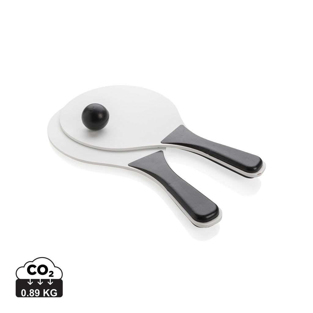 Beach-Ball Set aus MDF mit Griffen aus PP und einem Ball. In einem Netz verpackt.