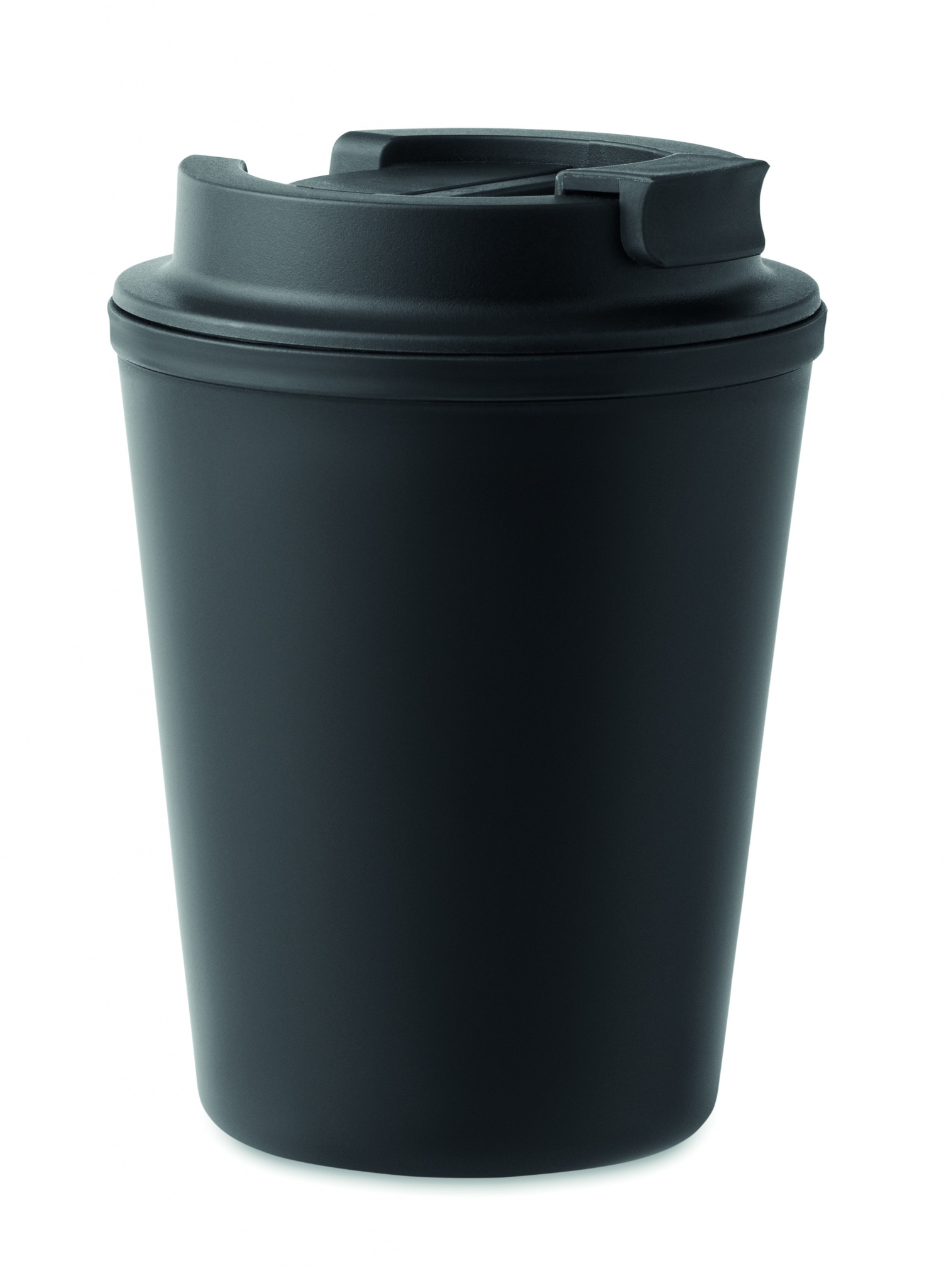 Doppelwandiger Trinkbecher mit Trinkdeckel aus recyceltem PP. Füllmenge: 300 ml.