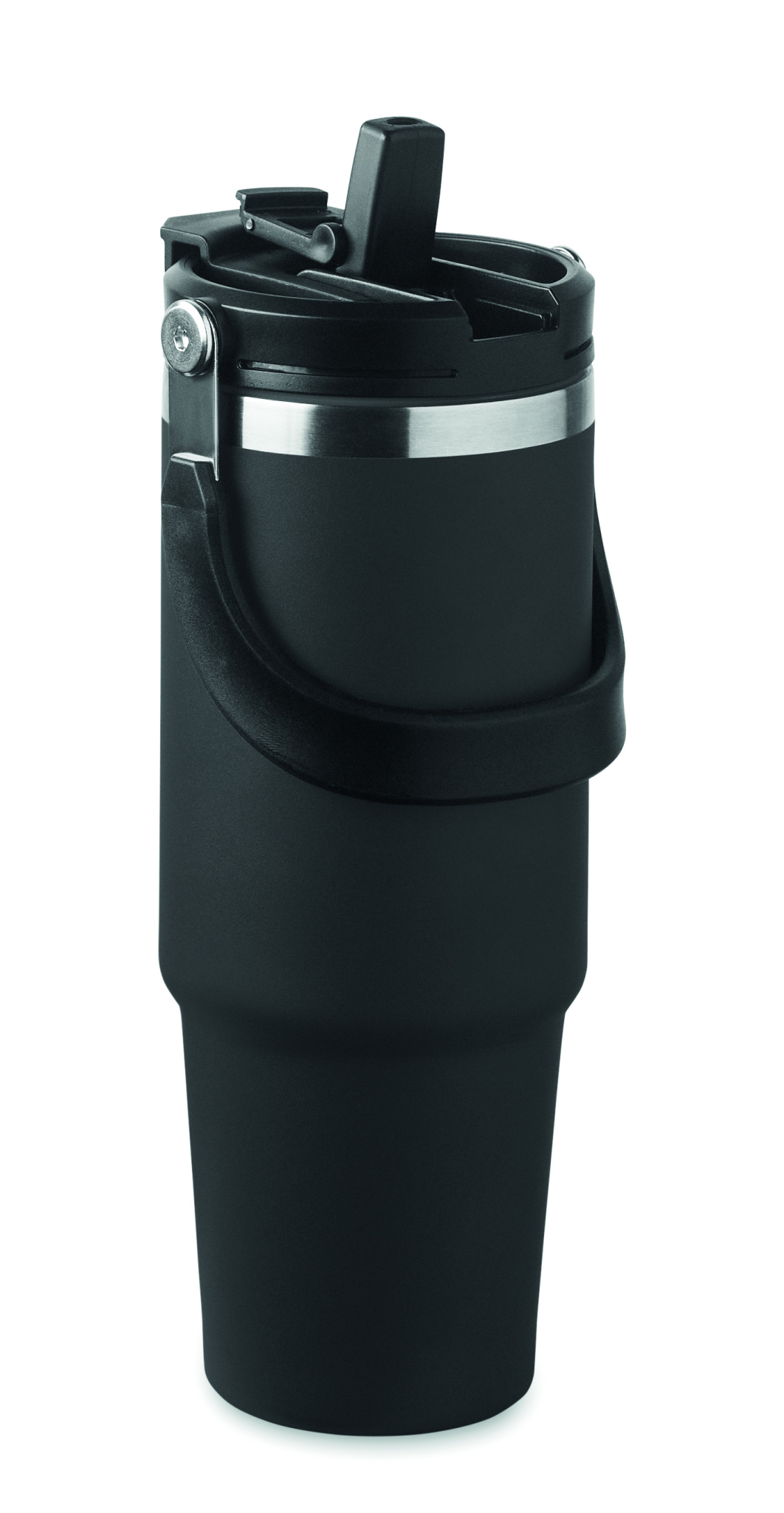 Doppelwandiger Trinkbecher aus recyceltem Edelstahl (90 % recycelter Edelstahl und 10 % Edelstahl). Verschluss mit integriertem Trinkhalm und klappbarer Trinköffnung. Füllmenge: 850 ml.