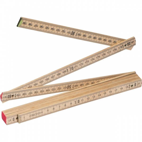 Holz-Gliedermaßstab mit einem Messbereich von bis zu 2 Metern. Ihre Werbung wird auf den Gliedermaßstab gedruckt. Bitte beachten Sie, dass es sich um einen Werbeartikel und nicht um ein Profi-Werkzeug handelt.