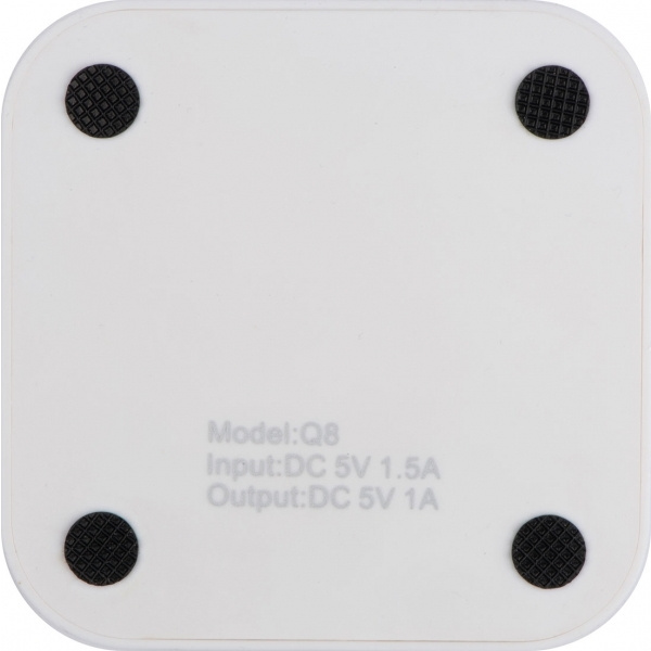 Kabelloses Ladegerät aus Kunststoff mit 2 USB-Anschlüssen, inklusive Ladekabel. Lädt alle QI-fähigen Smartphones. Ihr Logo wird auf das Gerät gedruckt.