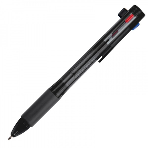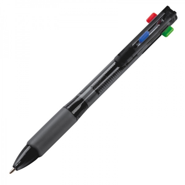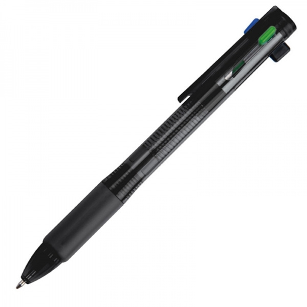 Kugelschreiber aus Kunststoff mit 4 farbigen Schreibminen (blau, schwarz, rot und grün). Ihre Werbung wird unterhalb des Clips aufgedruckt.