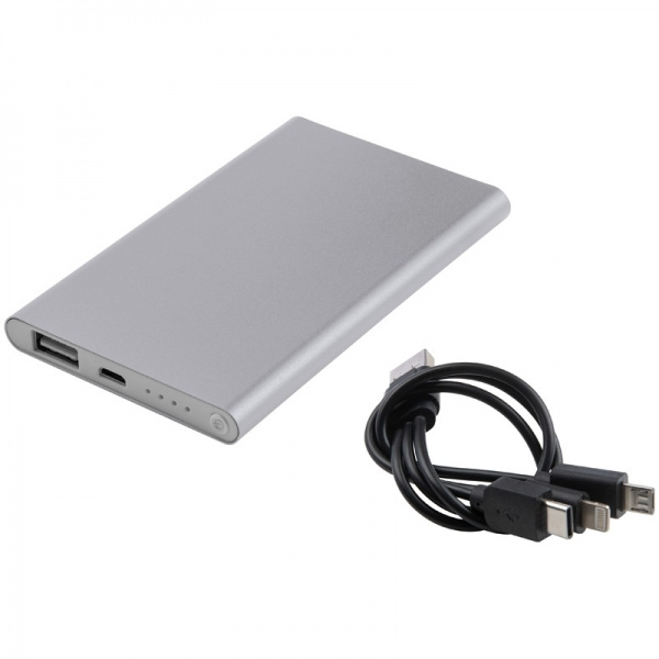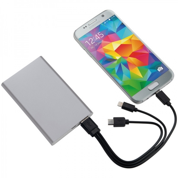 Aluminium-Powerbank mit 4.000 mAh Ladekapazität, Ladestandsanzeige, Multiplug-Ladekabel (Lightning, USB Type C und Micro-USB). Ihre Werbung wird eingraviert.