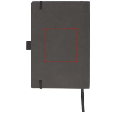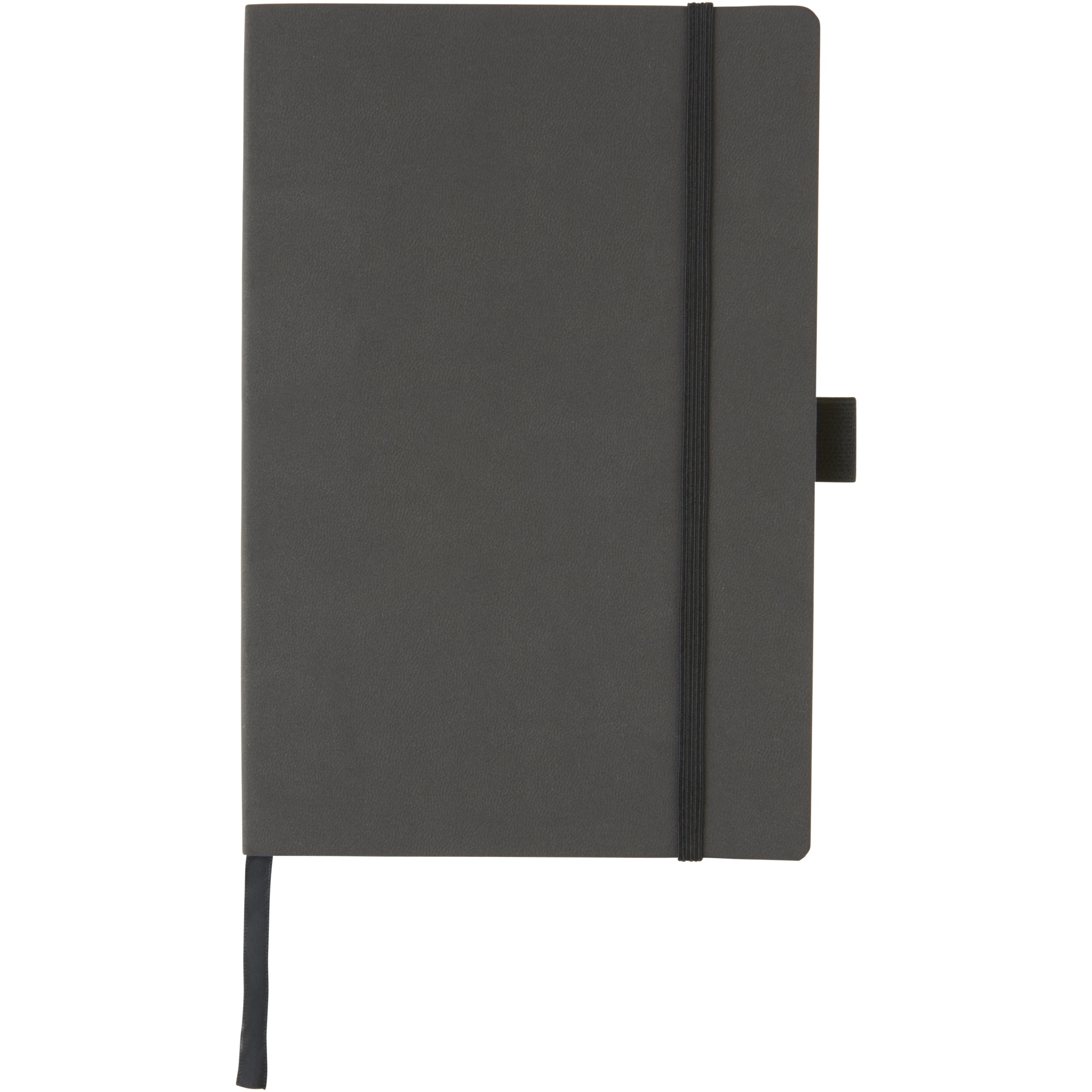 Flexibles Notizbuch mit weichem Einband (A5 Größen-Referenz) mit integriertem Gummiband-Verschluss, Lesezeichen-Bändchen, Stiftschlaufe, Dokumententasche an der inneren Rückseite und 80 Blatt (80 g/m²) cremefarbenem liniertem Papier. Verpackt in einer schwarzen Hülle.