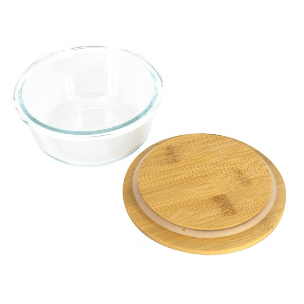 Universalschüssel aus Borosilikatglas mit sicher schließendem Bambusdeckel und einem Füllvolumen von 300 ml. Ihre Werbung wird in den Deckel eingraviert.