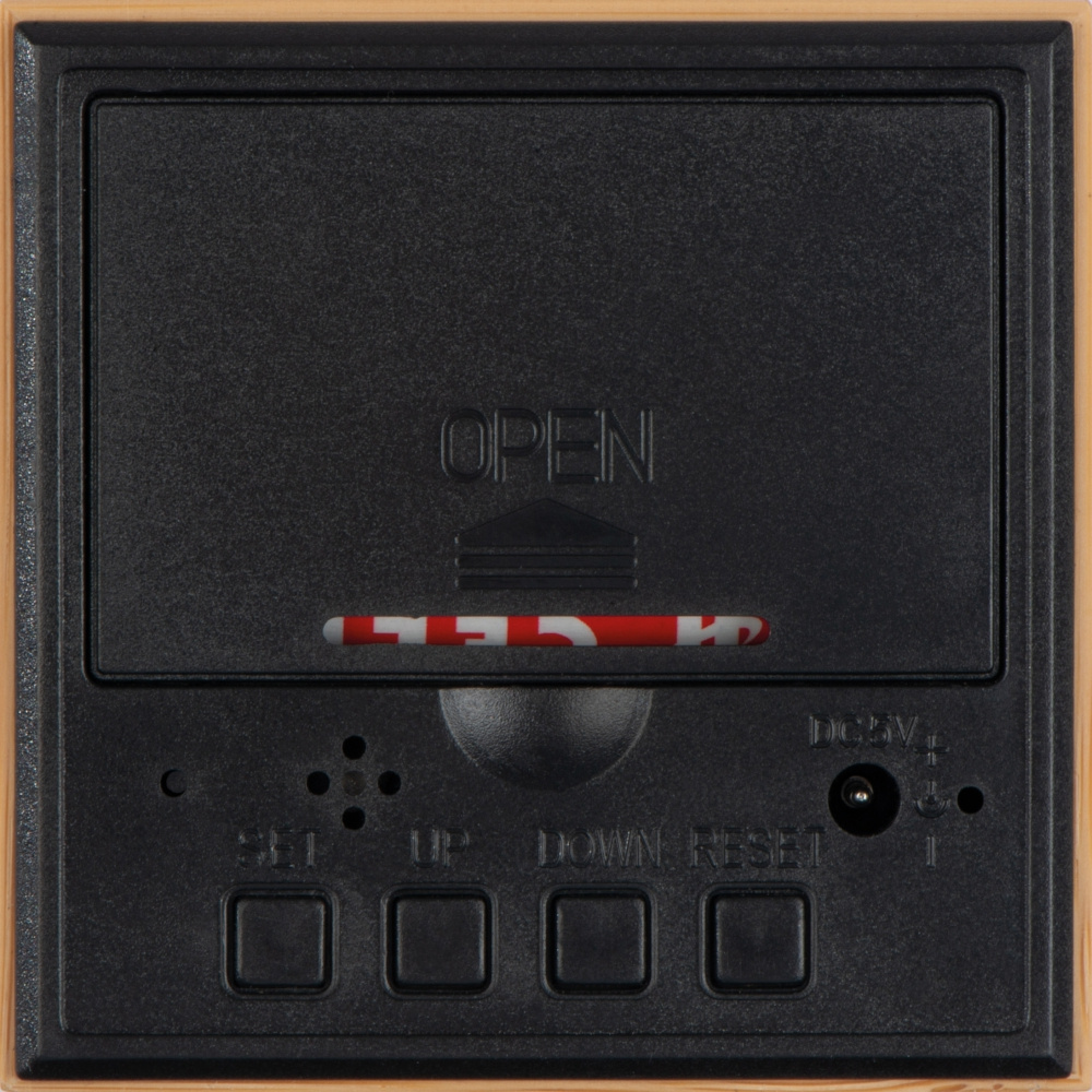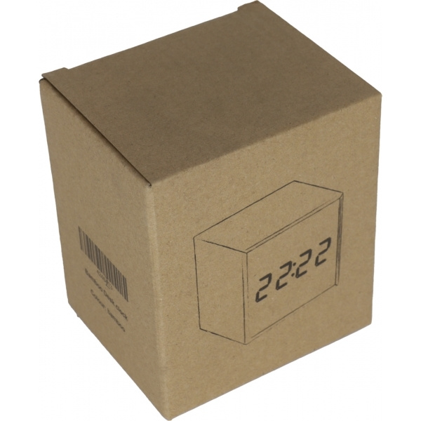 Elegante Tischuhr mit Holzbeschichtung, schwarzer Anzeigefläche und blauen LED-Buchstaben, die abwechselnd Uhrzeit, Datum und Temperatur anzeigen. Ihre Werbung wird auf der Oberseite eingraviert.