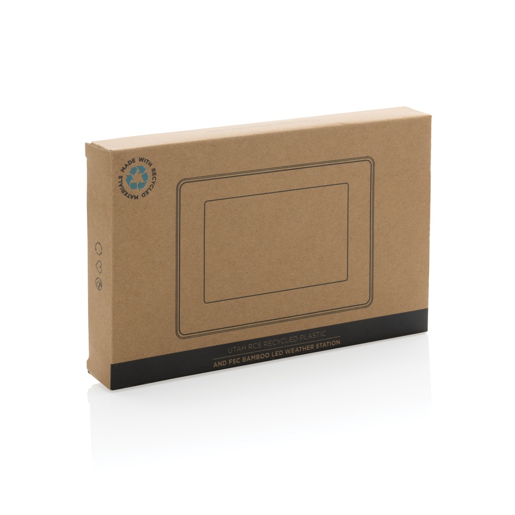 Große Wetterstation aus RCS (Recycled Claim Standard)-zertifiziert recyceltem ABS und 100% FSC®-Bambus. Gesamter Recyclinganteil: 76% bezogen auf das Gesamtgewicht des Artikels. Die RCS-Zertifizierung gewährleistet eine vollständig zertifizierte Lieferkette der recycelten Materialien. Mit hochwertigem LED-Bildschirm. Funktionen: Uhr, Wecker, Kalender, Temperatur, 12/24-Stunden-Option, Fahrenheit/Celsius. Inklusive 100cm Type-C Ladekabel aus RCS-zertifiziertem Recycling-TPE. Verpackt in FSC®-Mix-Kraftkarton.
