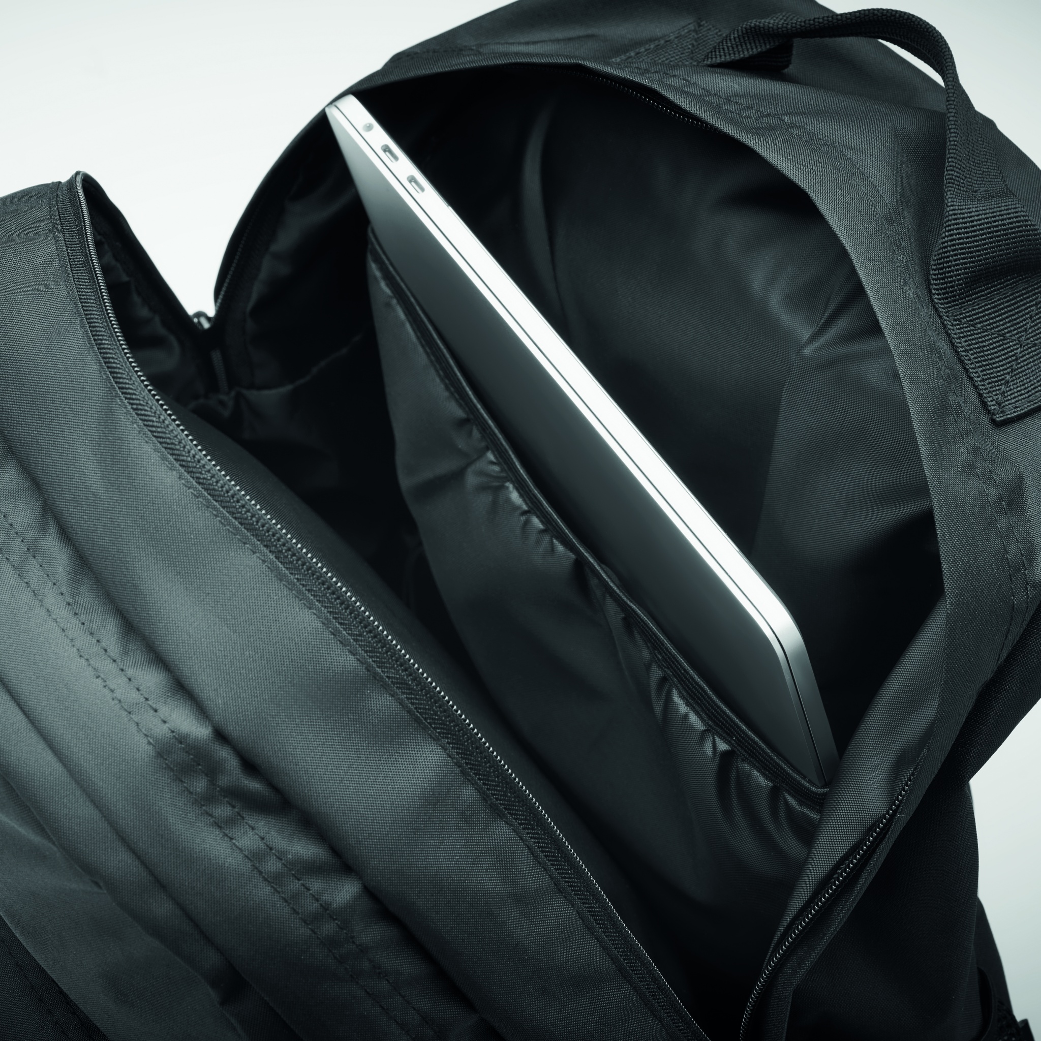 15 inch laptop backpack in 300D RPET polyester. It has 2 large zippered compartments, double zippered front pockets and mesh side pocket. Padded back, bottom and shoulder straps.