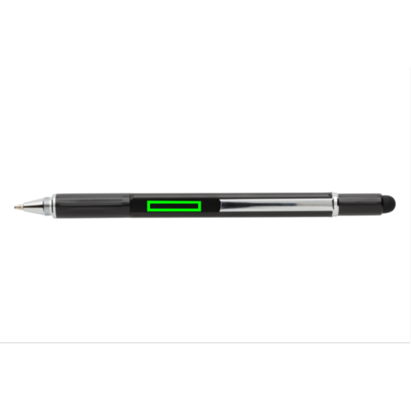 Multifunction pen with ruler (7cm) , spirit level, screw driver, stylus tip and ballpoint with blue writing ink (up to 400m) Made out of high quality brass material with aluminium clip.