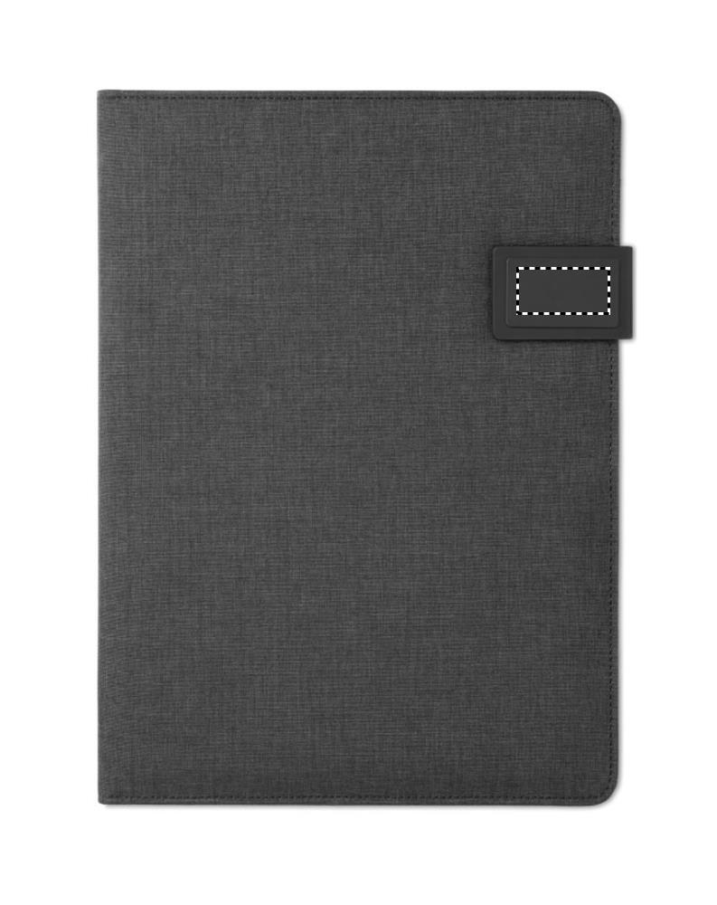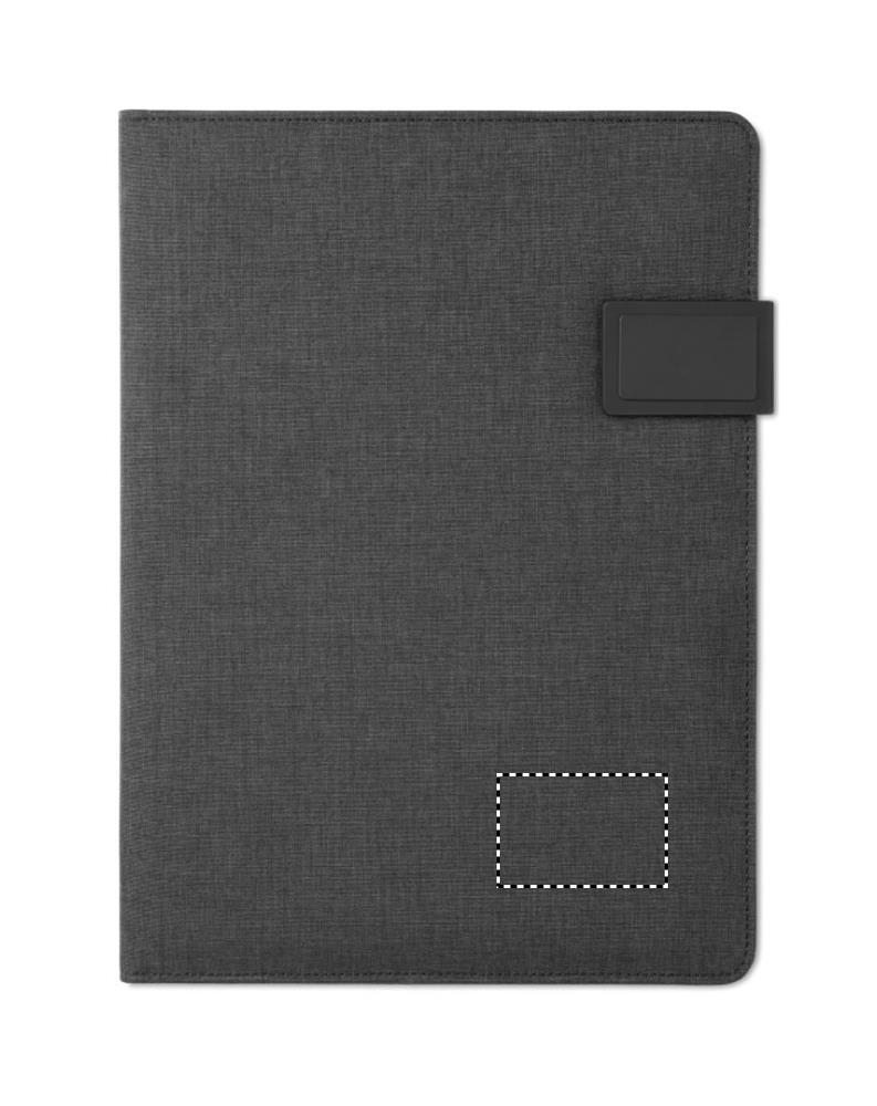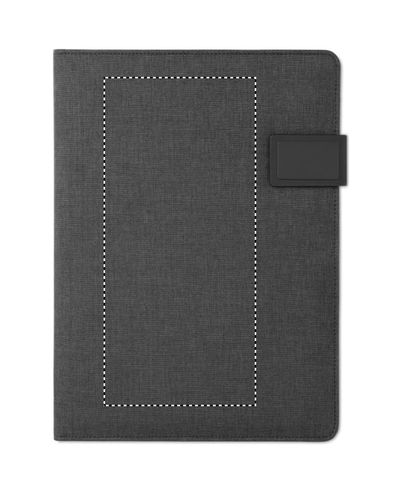 A4 conference folder with linen-PU cover. 4000 mAh power bank. Built-in micro USB to a Type C connector. 20 lined sheets notepad. Multiple internal compartments. Magnetic closure. Elastic pen holder.