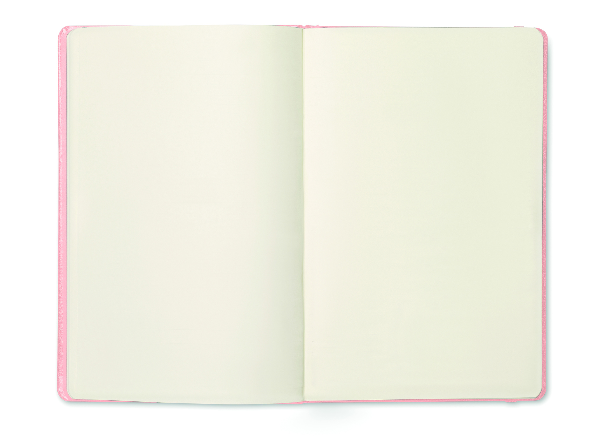 A5 notebook with hard PU cover. Casebound. 192 plain pages (96 sheets). Matching elastic closure strap and ribbon page-marker.
