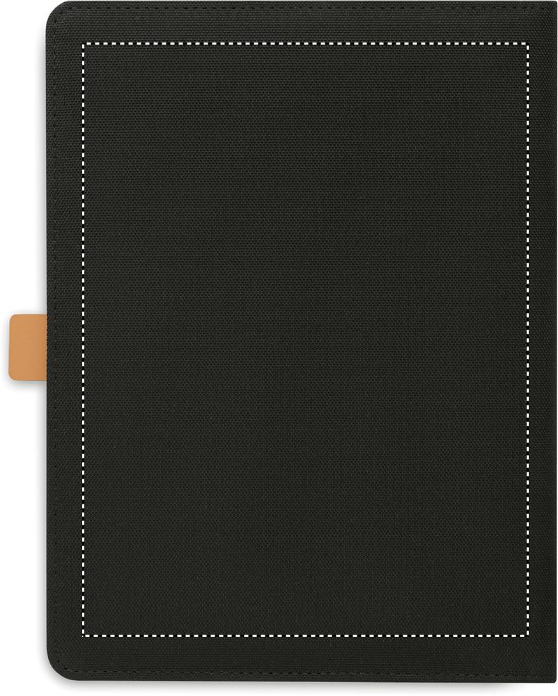 A5 portfolio in RPET with faux leather details. Replaceable A5 notebook with hard cork cover. Case bound. 128 recycled paper lined pages (64 sheets). Pen holder. 2 cardholders and one big compartment. Elastic closure strap with metal detail.
