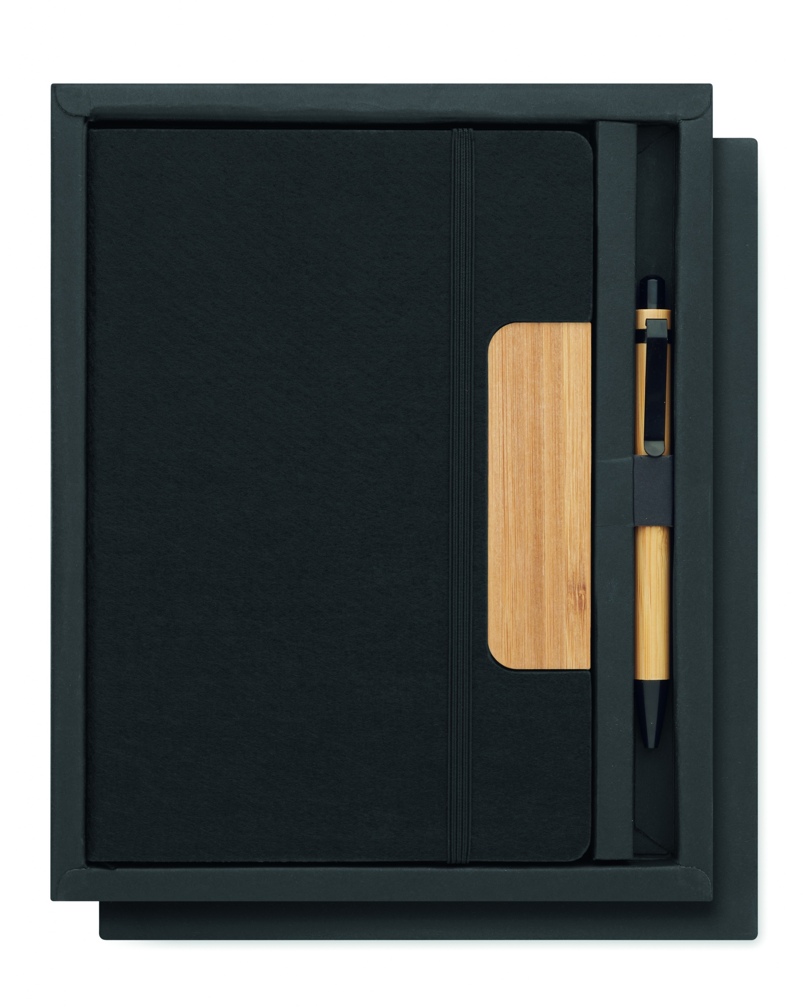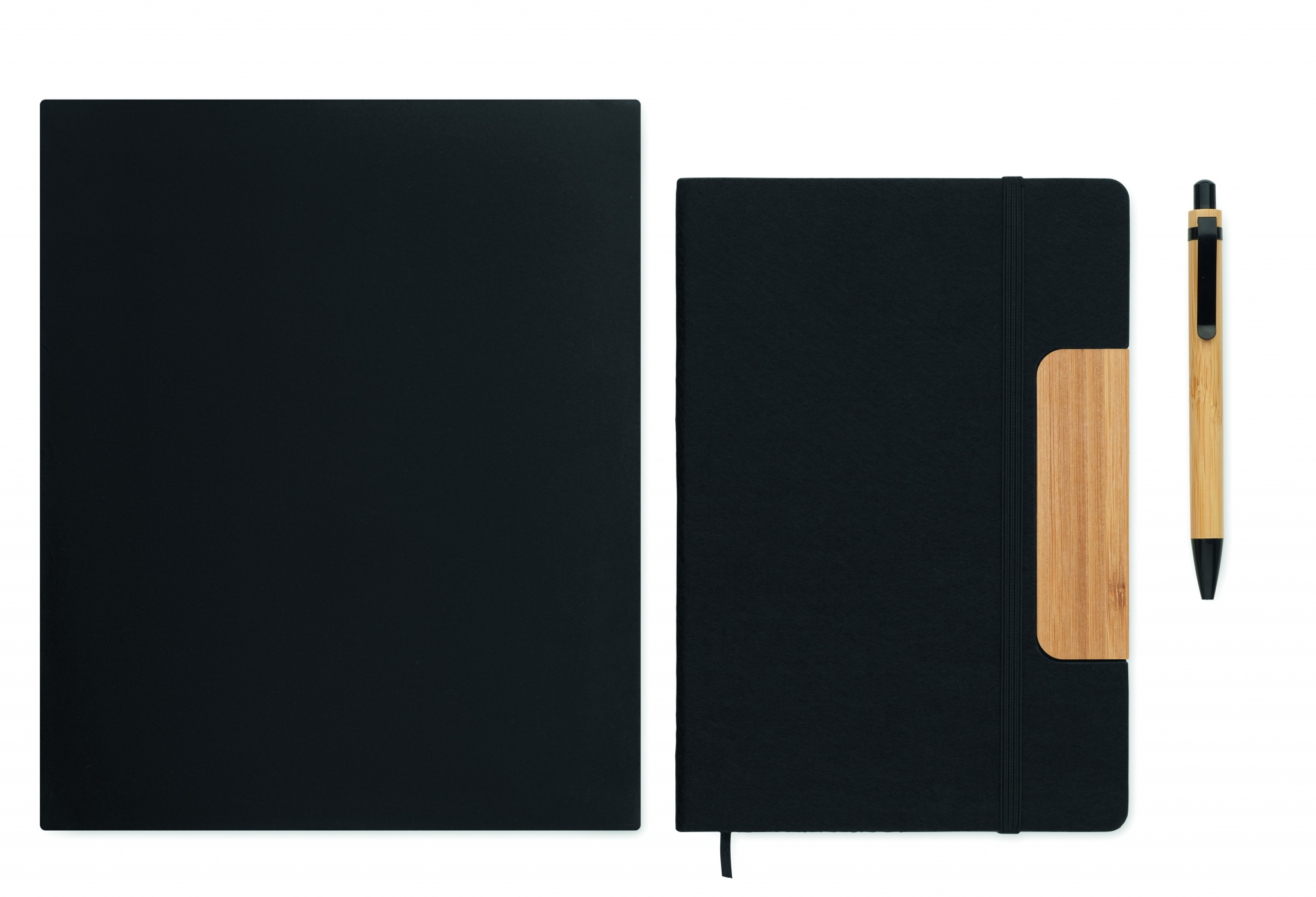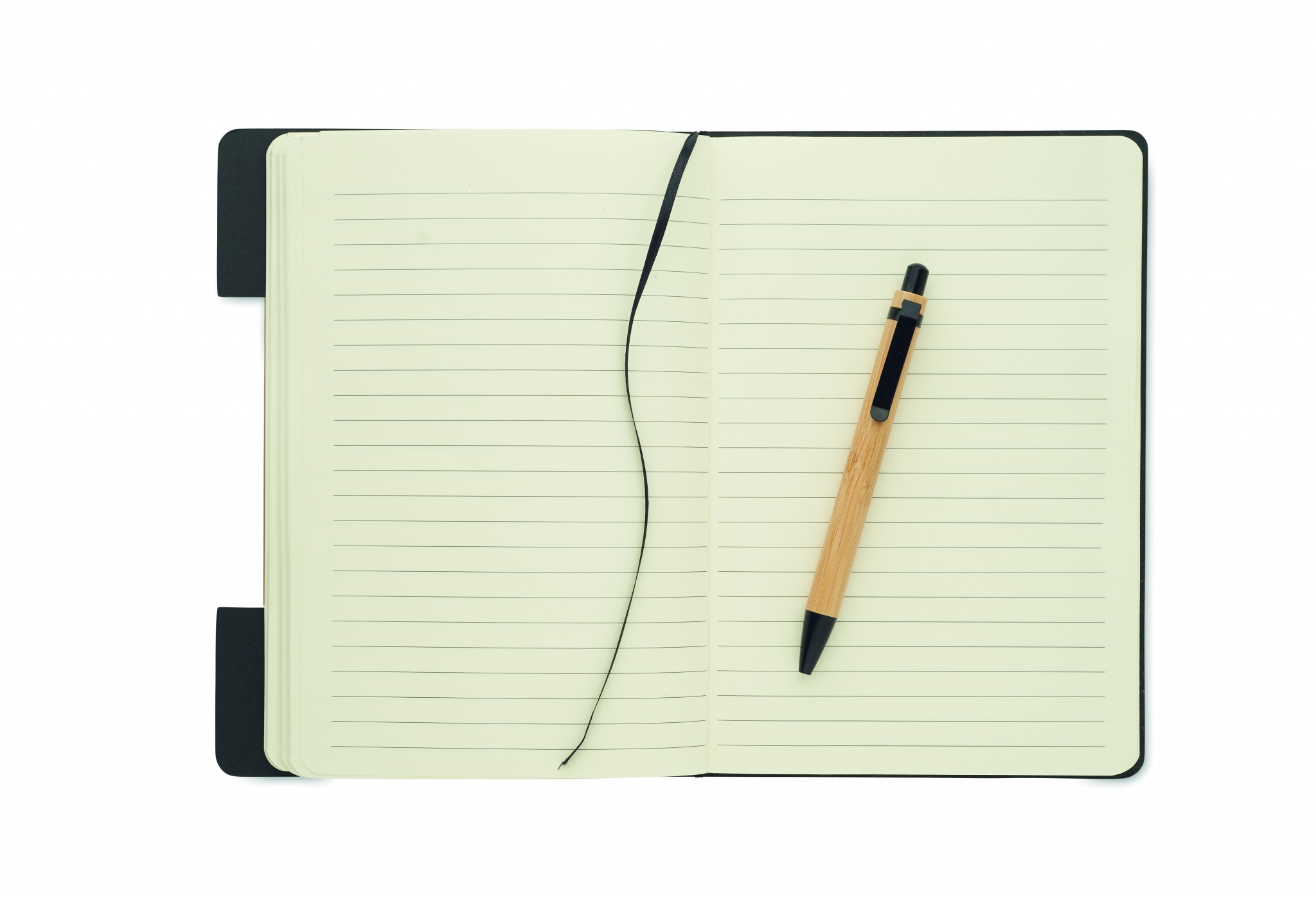A5 RPET felt hard cover notebook set with phone stand functionality and push ball pen with bamboo barrel. Case bound. 160 recycled paper lined pages (80 sheets). Elastic closure strap. Ribbon bookmark. Blue ink.