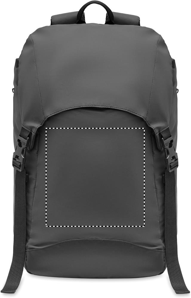 Outdoor backpack in 190T polyester coated with reflective granules. Side zippered outer pocket and padded back, inner lining with drawcord closure. One large padded inner laptop compartment. It has adjustable padded shoulder straps and adjustable chest and waist strap with buckle closure. Water repellent.