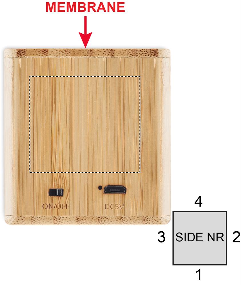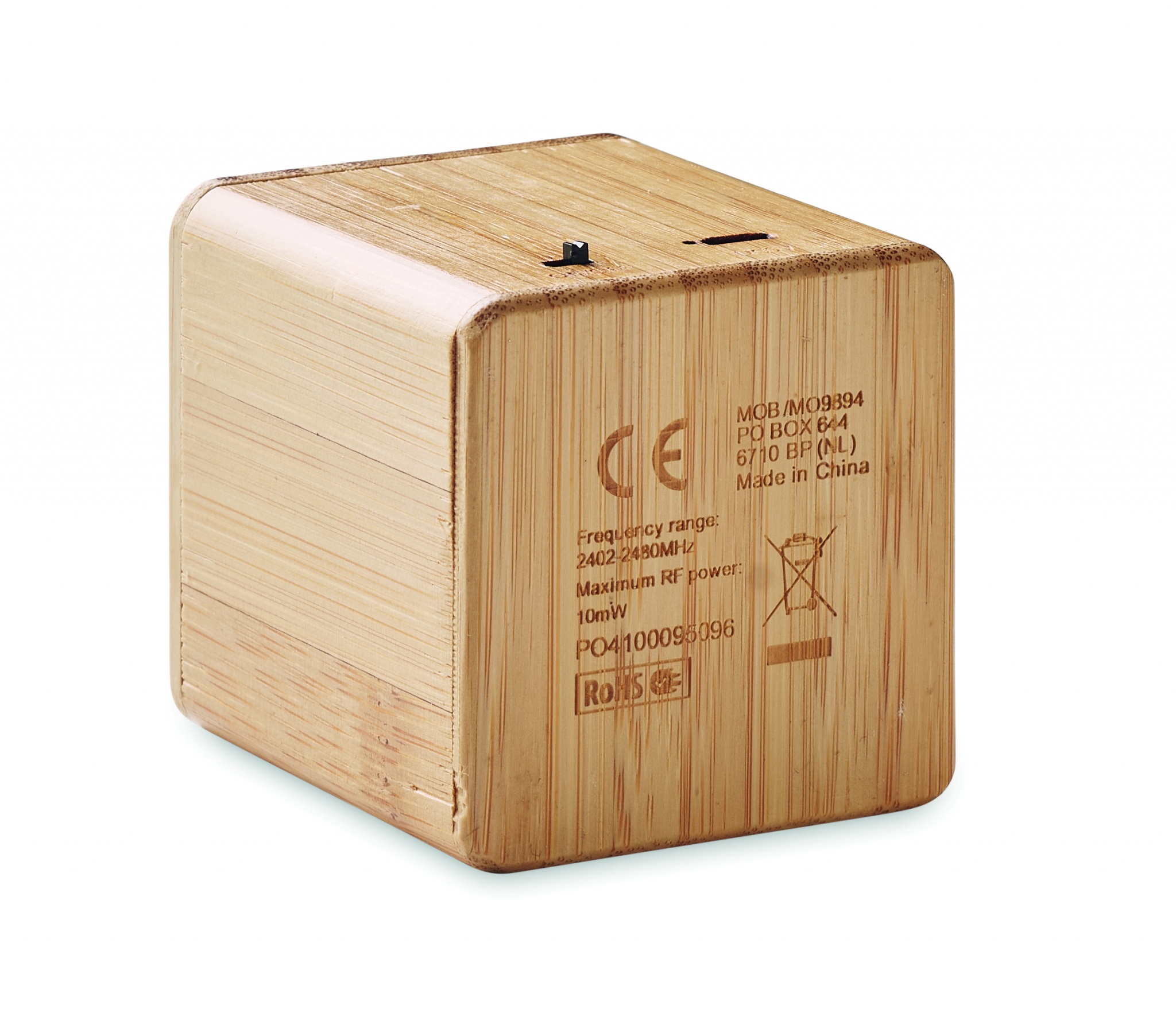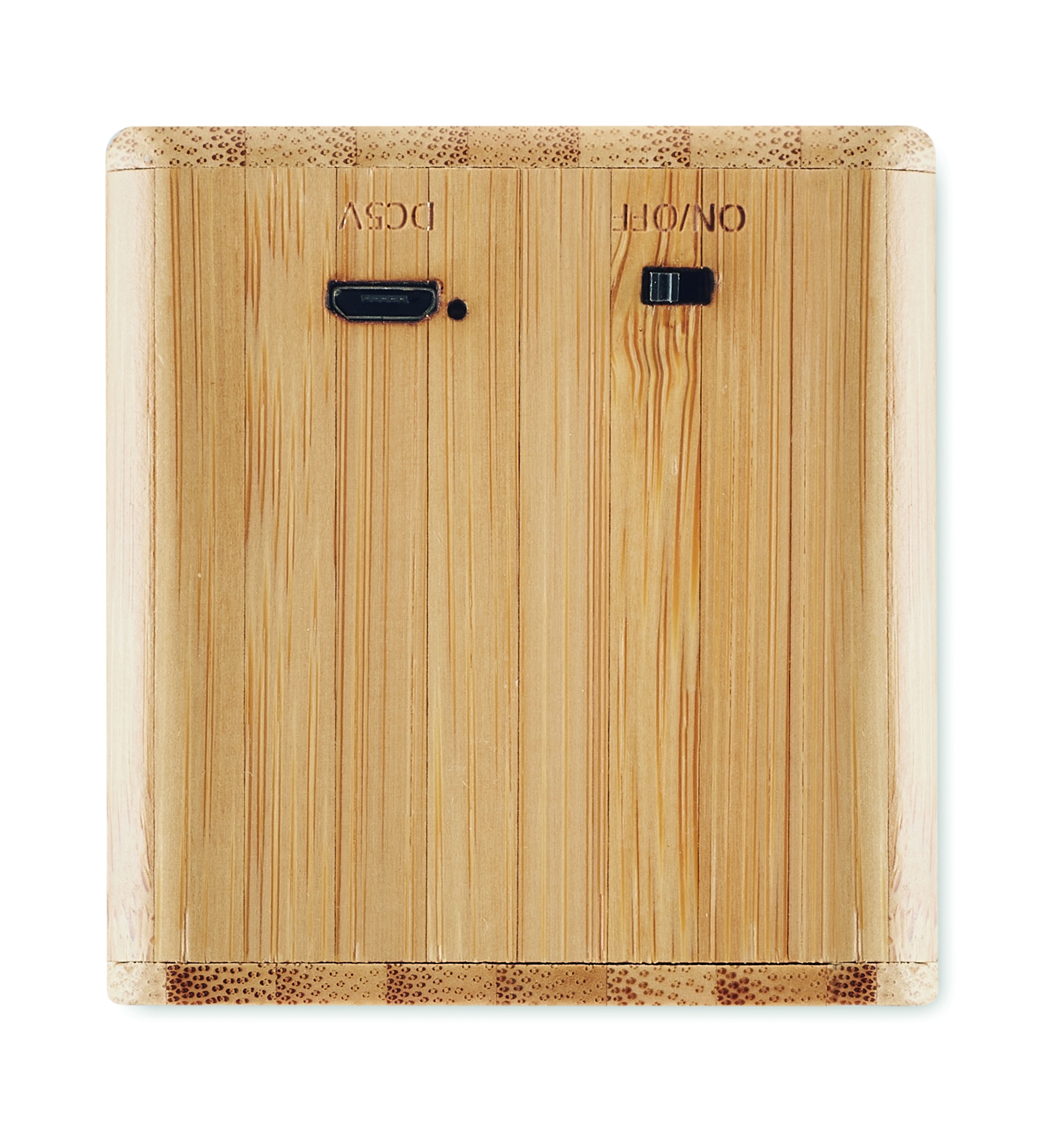 5.0 wireless speaker with bamboo casing with LED light indication. 1 Rechargeable Lithium 500 mAh battery included. Output data: 3W, 3 Ohm and 5V. Playing time approx. 4h (70% volume). Bamboo is a natural product, there may be slight variations in colour and size per item, which can affect the final decoration outcome.