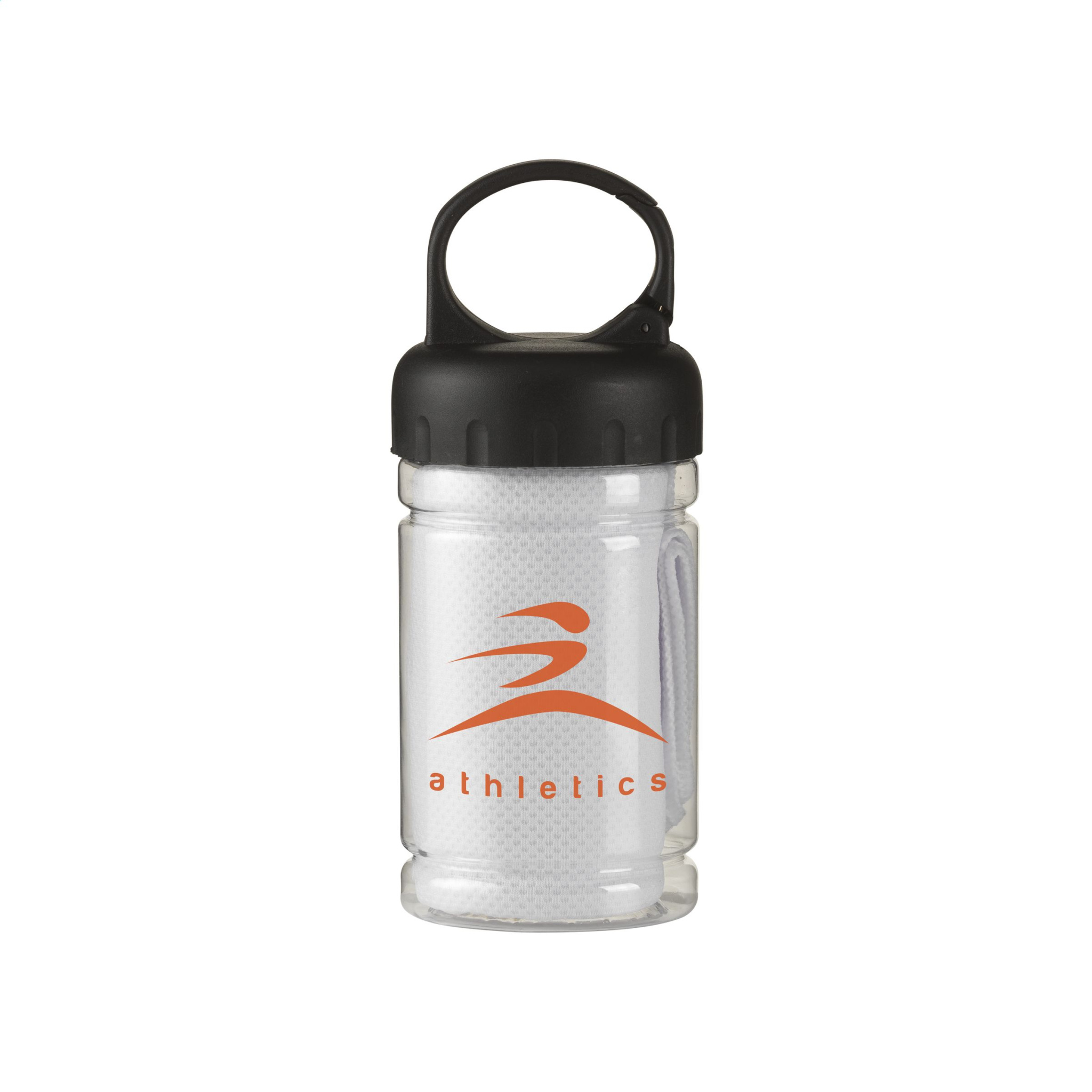 Special cooling towel made from 100% polyester. After immersing in cold water, this towel is an effective cooling instrument and a deterrent to sunburn. Size 30 x 80 cm. Ideal to wear as a neck cooler. Comes in a transparant case with ABS screw cap with carabiner hook.