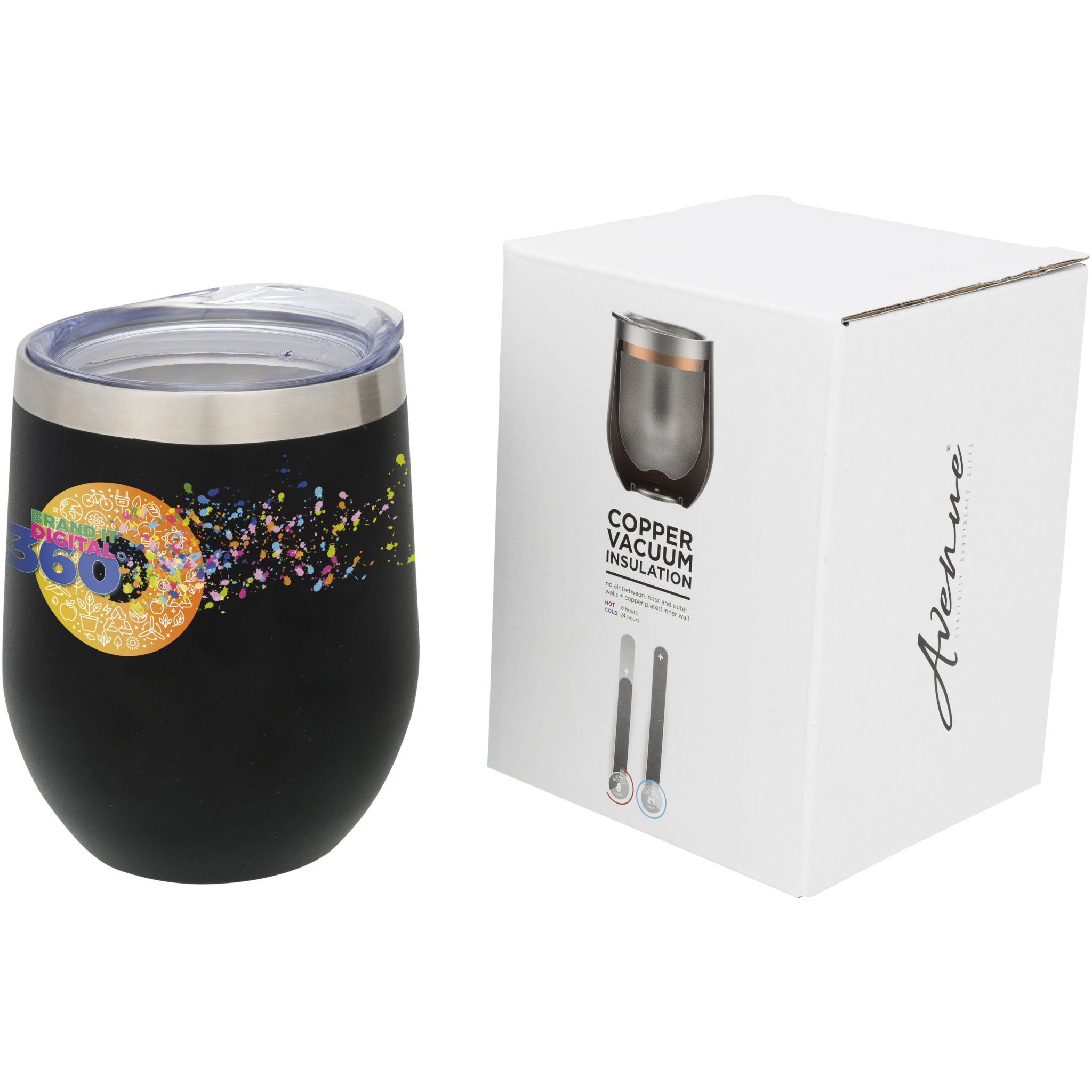 The Corzo copper vacuum insulated cup has a double-wall vacuum construction with copper insulation which means it keeps drinks hot for 6 hours and cold for 24 hours. The construction prevents condensation on the outside of the tumbler. Easy sipping, push-on lid. Features spray powder coating on the outer body. Wide opening for comfortable filling and pouring. Volume capacity is 350 ml. Presented in an Avenue gift box.