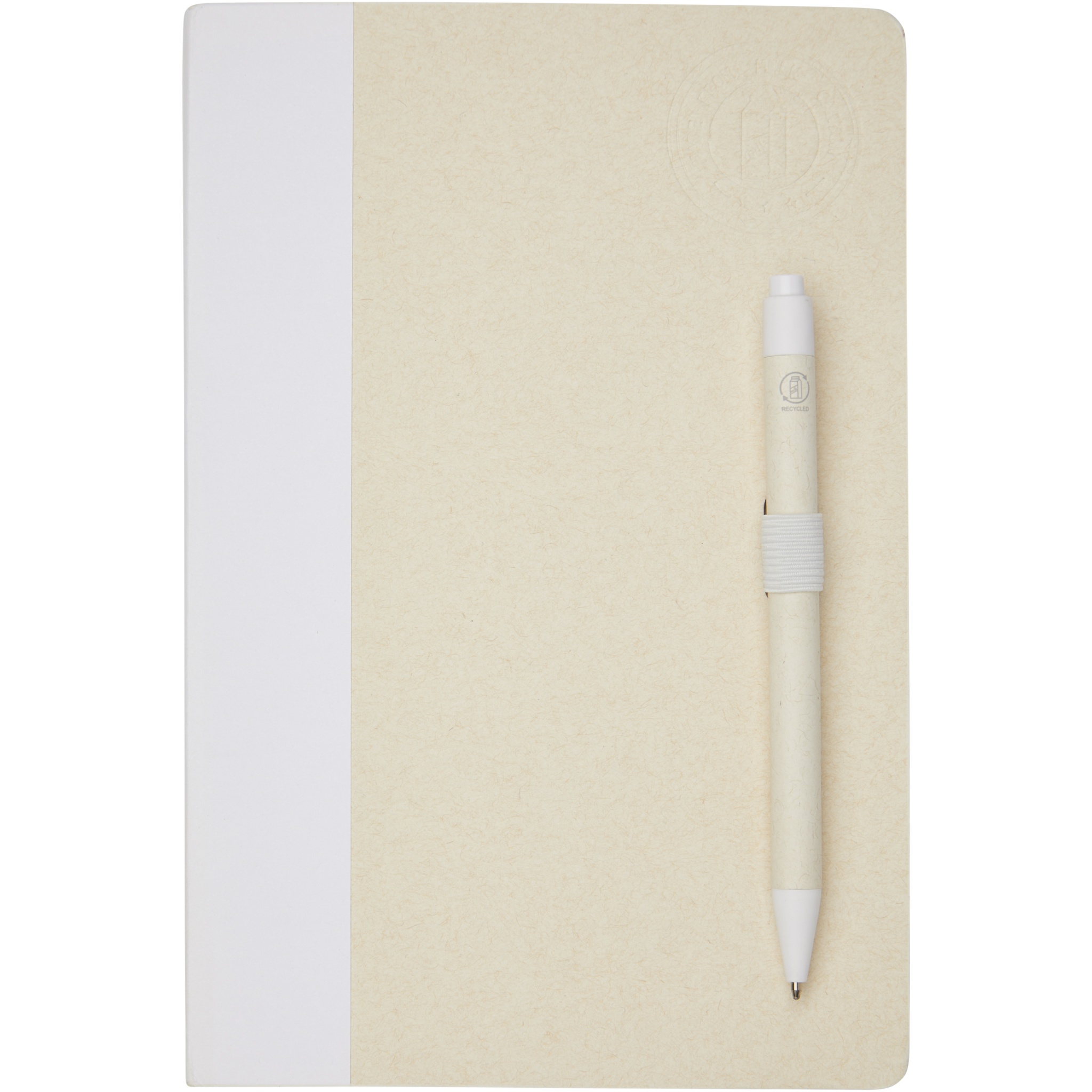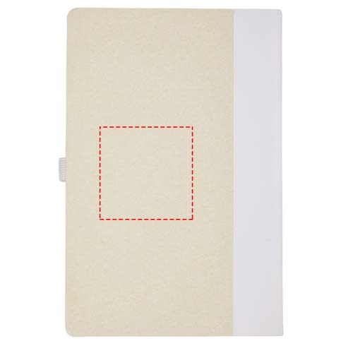 A5 size reference notebook and ballpoint pen set. The notebook features 80 lined sheets (80 g/m²) made from recycled milk cartons (up to 70%), a coloured paper spinal, and a pen loop. In the pen loop, there is a click-action ballpoint pen in matching colour of the notebook. The pen has a barrel made of the same recycled milk carton material and the button, clip, and tip is made of coloured PLA plastic. The pen features a black refill inside. Used milk cartons are collected, sorted, processed, and turned into paper, truly turning waste into something useful.