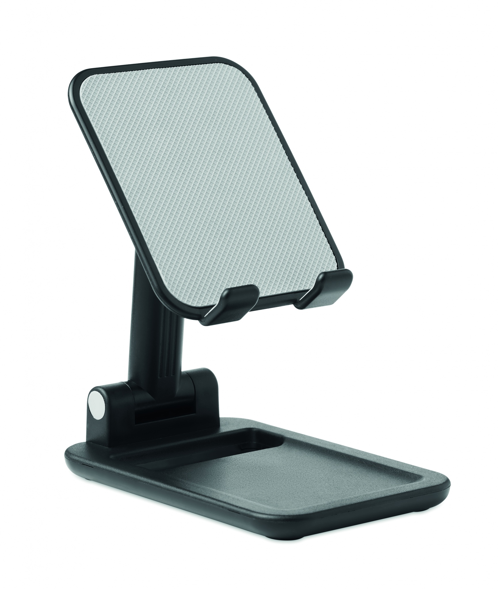 Foldable smartphone or tablet holder in ABS material and base with anti slip. Allows the user to adjust the device for ideal viewing angle.