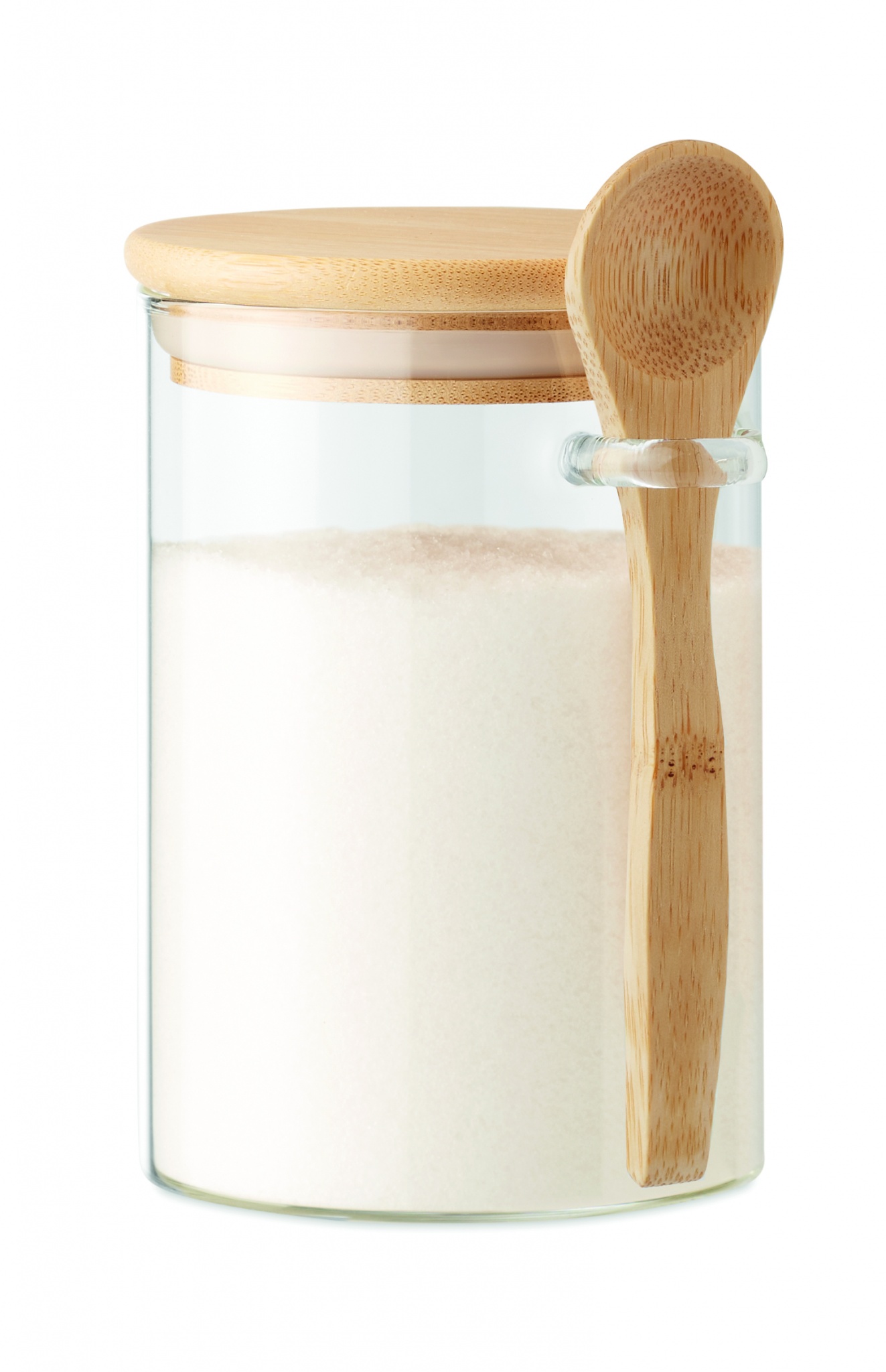 Borosilicate glass storage jar with bamboo lid and spoon. Capacity: 600 ml. Bamboo is a natural product, there may be slight variations in colour and size per item, which can affect the final decoration outcome.