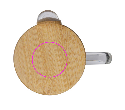 Borosilicate glass mug with a closable bamboo lid, integrated bamboo spoon and a capacity of 420 ml. Your logo will be engraved onto the lid.