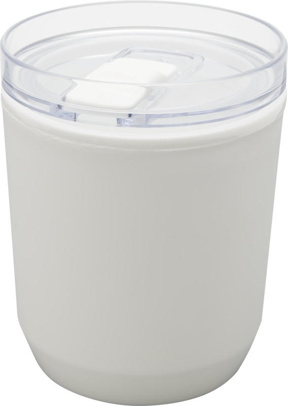 Tumbler with a simple design that fits most coffee machines and car cup holders. Features a double wall construction with a recycled PP plastic exterior and a PP plastic interior. The sliding lid is made from AS and PP plastic. Volume capacity: 180 ml.