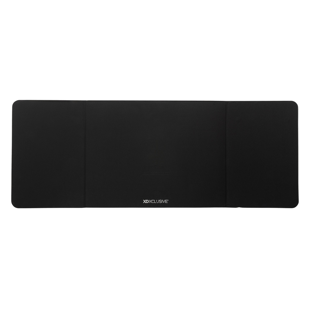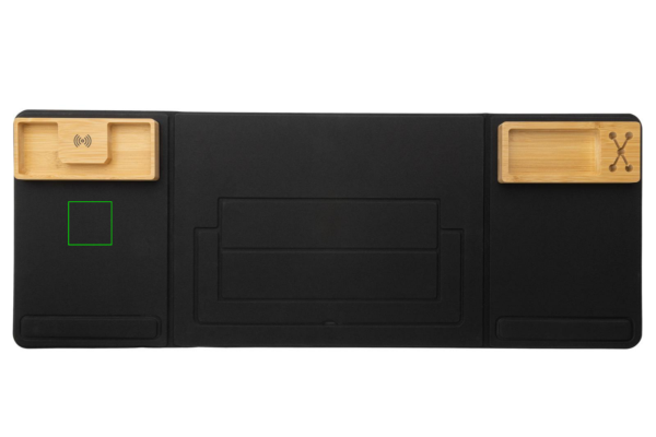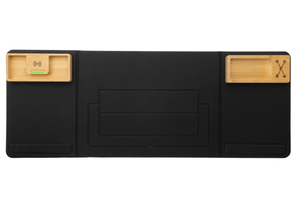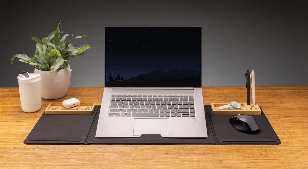 No greenwashing, but telling a true story about sustainability! This Impact collection is made with AWARE™ tracer. With AWARE™, the use of genuine recycled fabric materials and water reduction impact claims are guaranteed, by using the AWARE disruptive physical tracer and block chain technology. Save water and use genuine recycled fabrics. If you choose this item you save 6,6 litres of water and 11 plastic bottles have been reused. With the focus on water, 2% of proceeds of each Impact product sold will be donated to Water.org. Keep all your work essentials organised with the A5 AWARE™ RPET foldable desk organiser. Inside the organiser you can find a bamboo 10W wireless charger with pen holders and an easy tri-fold laptop stand ( max 17”). Interior and exterior 100% recycled RPET with AWARE™ tracer. PVC free. 120 cm RCS recycled TPE micro USB cable. The pen holder/ wireless charger are kept in place by magnets. Impact savings are based on reliable LCA data from the Textile exhange.