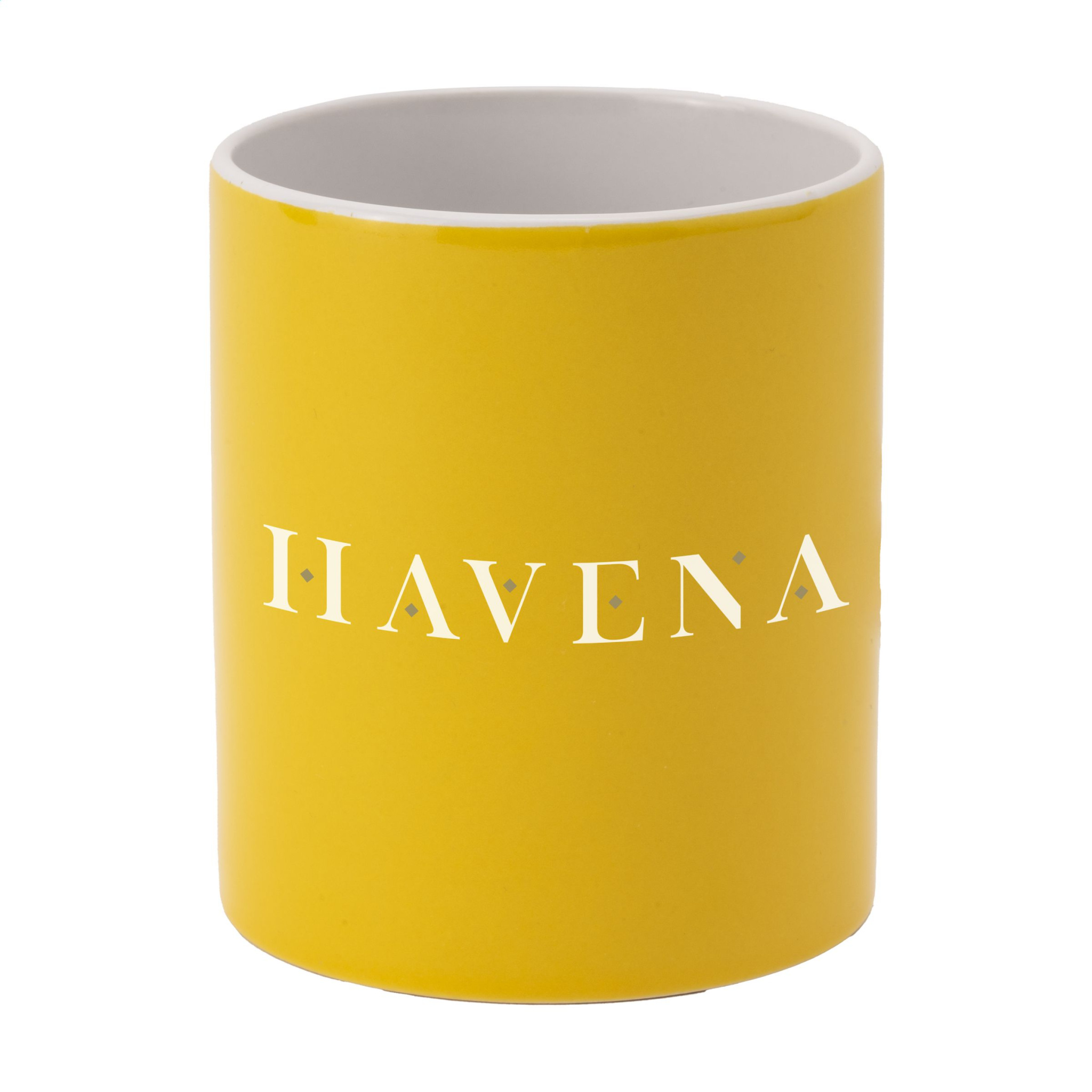High quality ceramic mug. In all white or with a coloured exterior. Dishwasher safe. The imprint is dishwasher tested and certified: EN 12875-2. Capacity 350 ml.