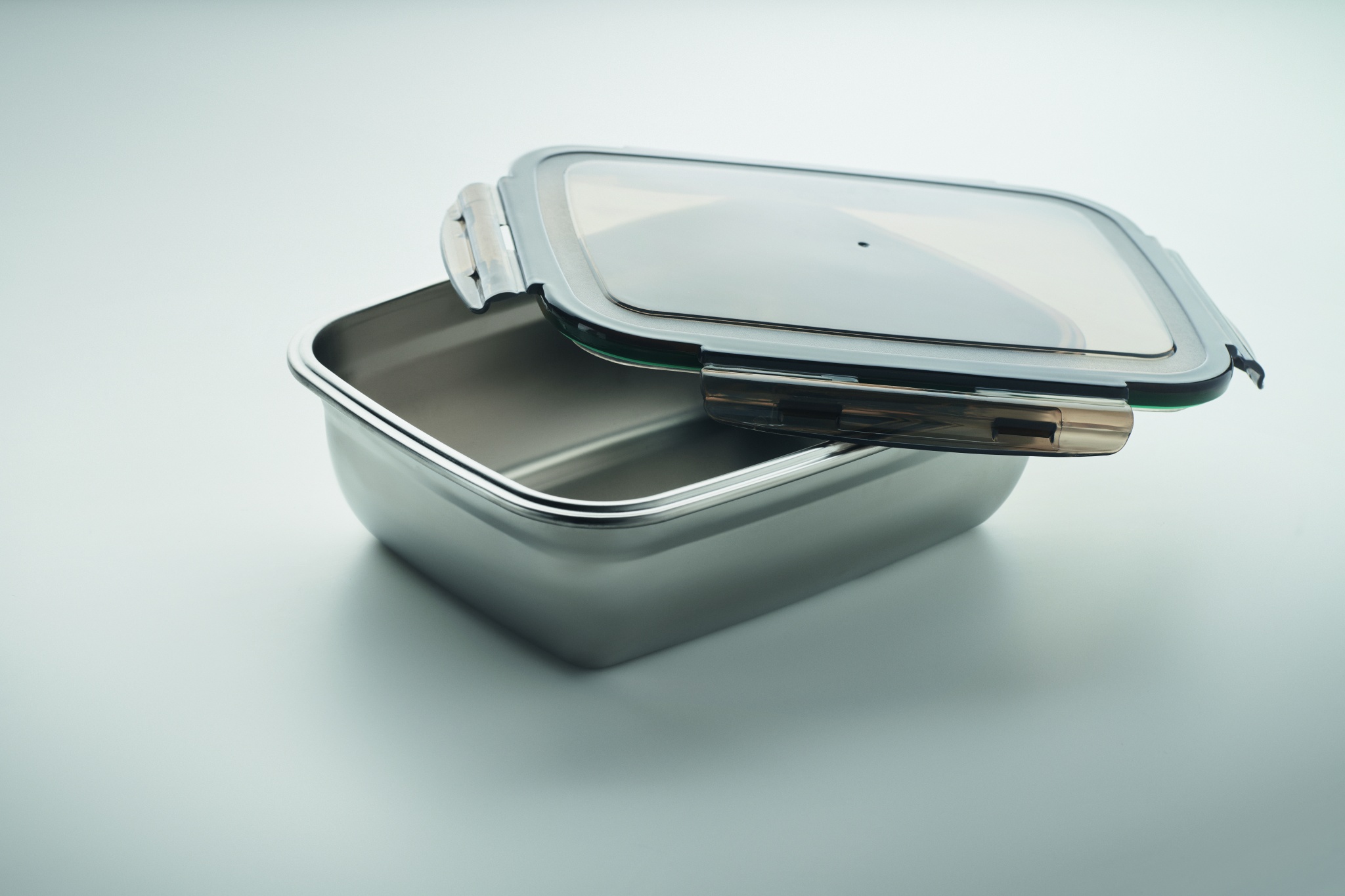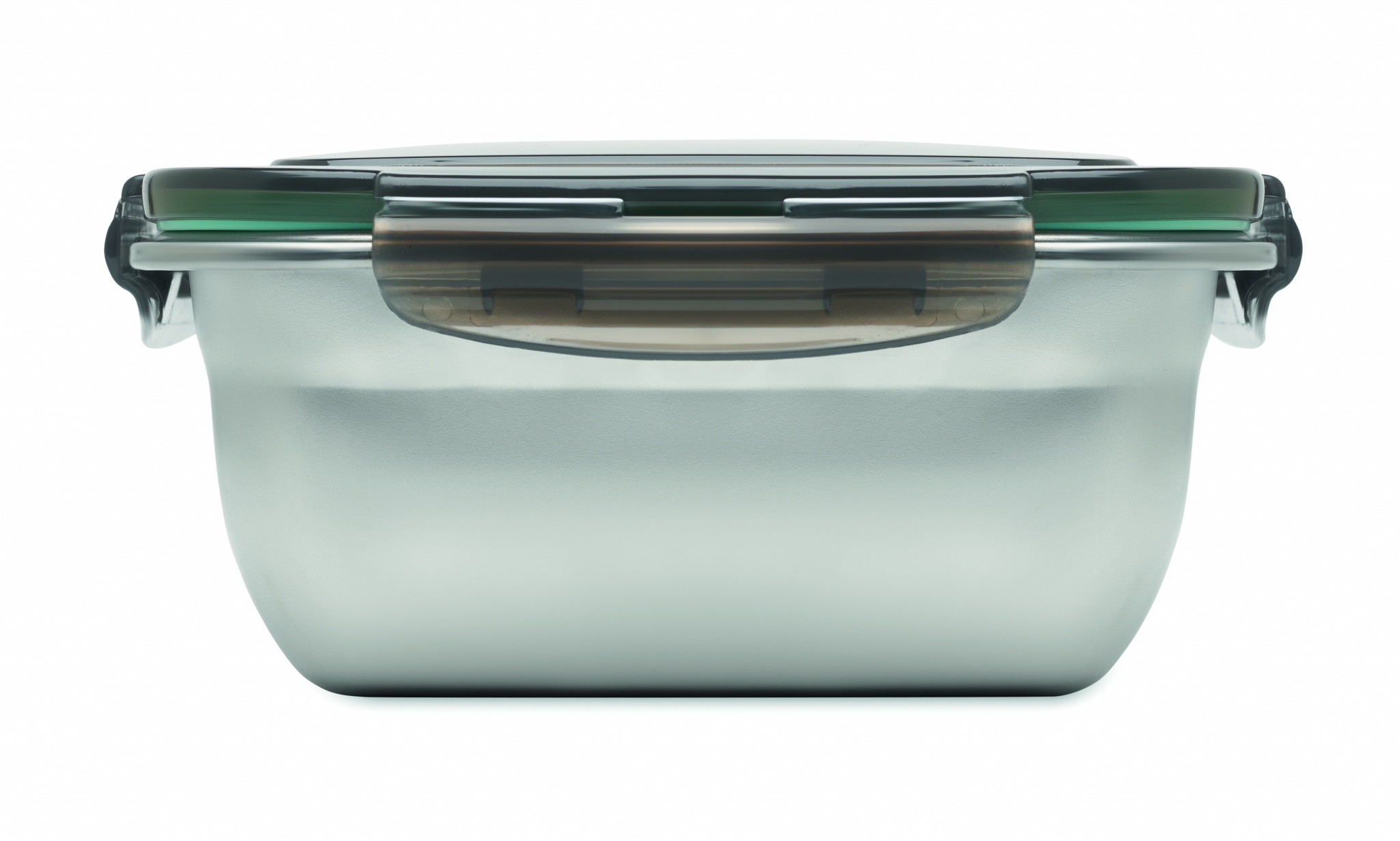 Recycled stainless steel lunch box with recycled PP lid and 4 side clasp closure. Including separator. Capacity: 1500 ml.