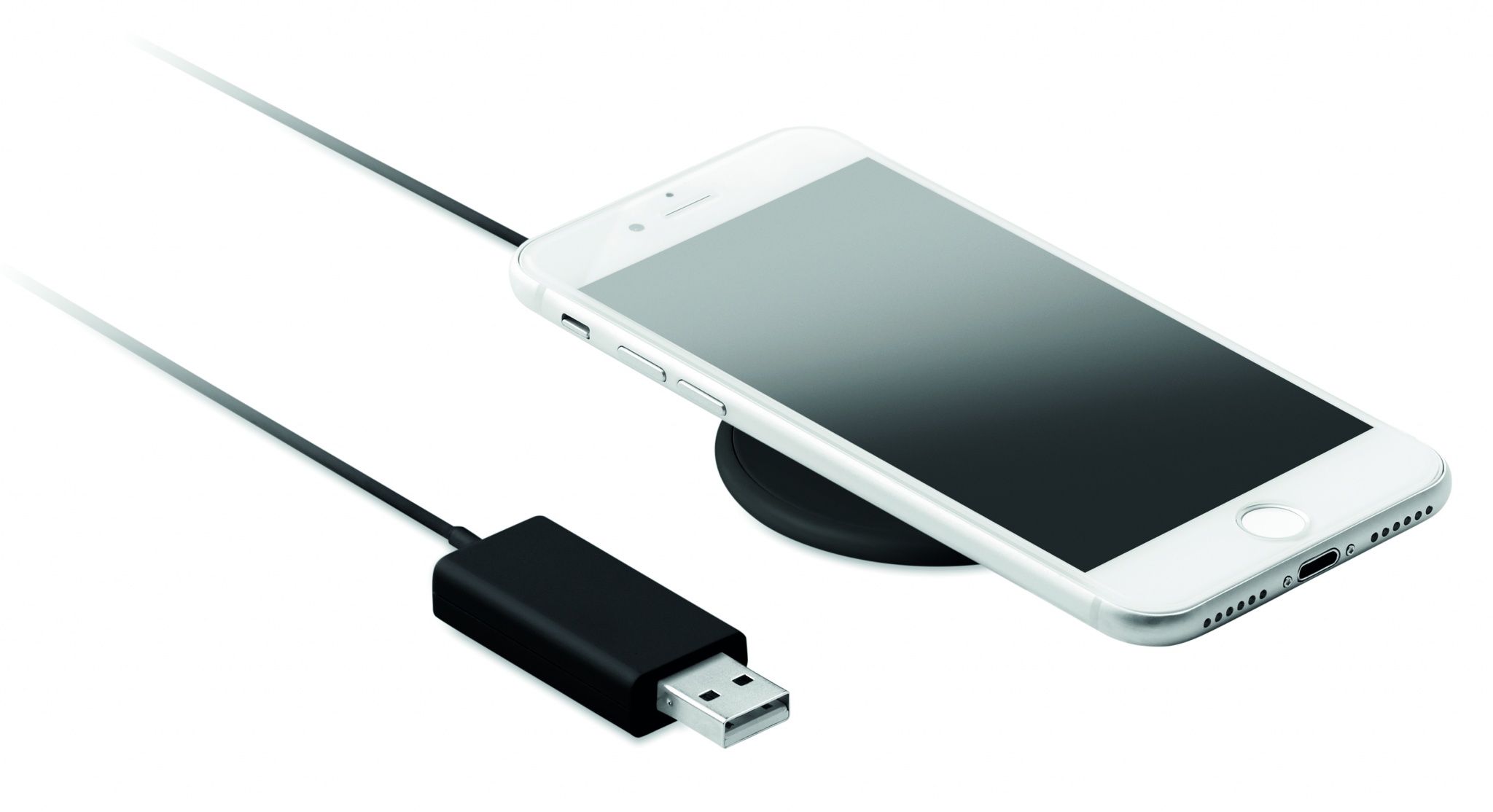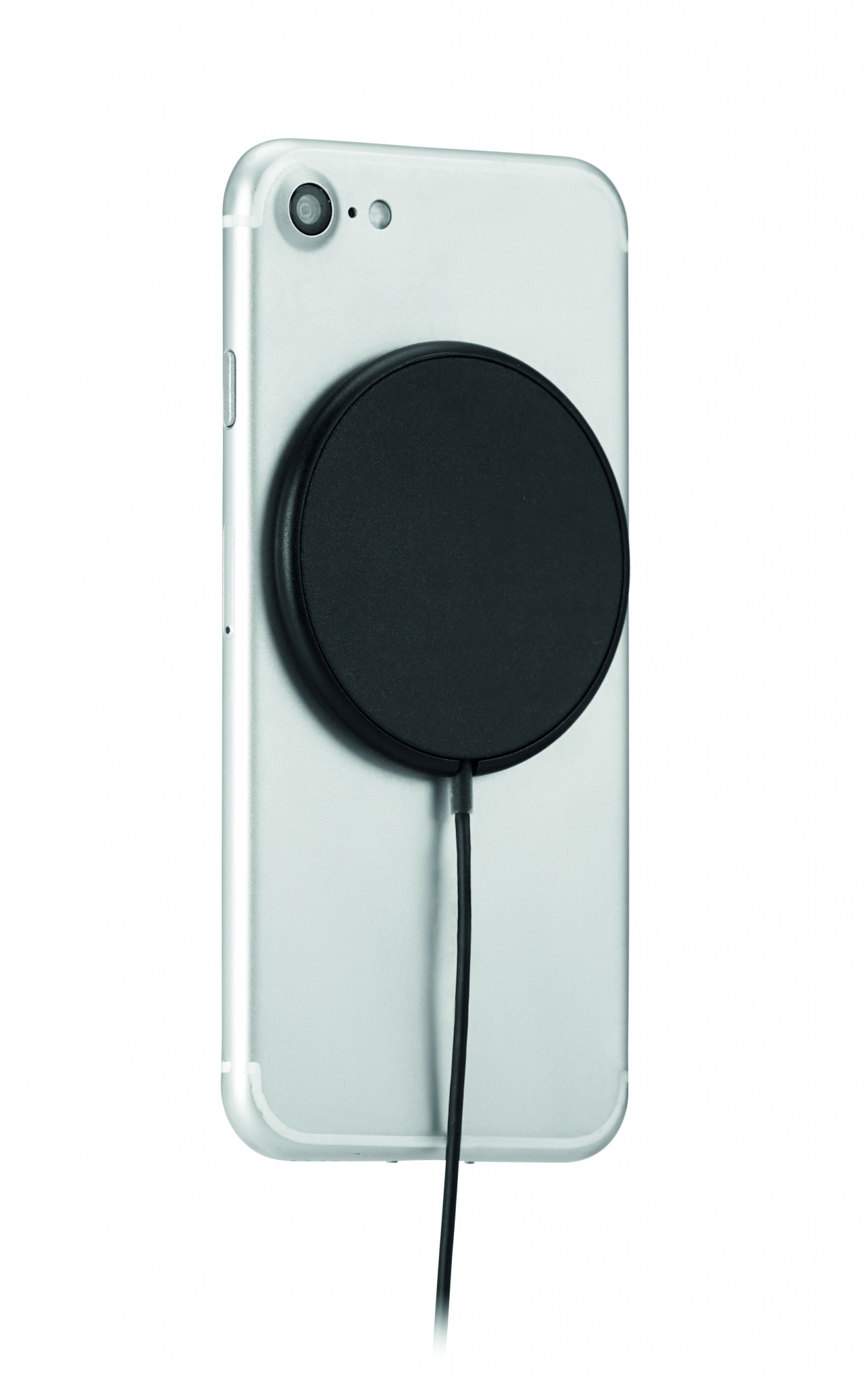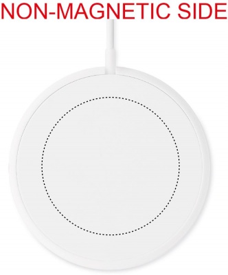 Magnetic wireless charger in ABS. Output: DC 9V/1.1A (10W) for quick charging. Compatible with iPhone® 12 and newer. Including additional magnetic metal ring to support charging of other non-magnetic wireless chargeable phones.