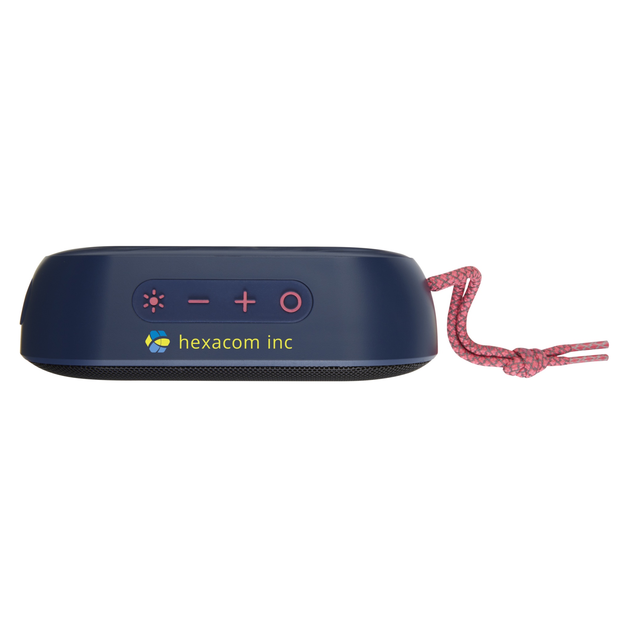 Powerful 7W IPX6 certified wireless speaker with RGB mood light, that is perfect for outdoor activities like a picnic, BBQ, beach or pool party. The built-in 1500mAh battery ensures up to 4 hours of playback time at max volume with RGB mood light ON. Bluetooth® 5.1 with a range up to 10 meters. Built-in microphone, pick-up function, and voice assistant for hands-free control. The speaker has an AUX jack and TF card slot (card not included). Delivered in a premium gift box.