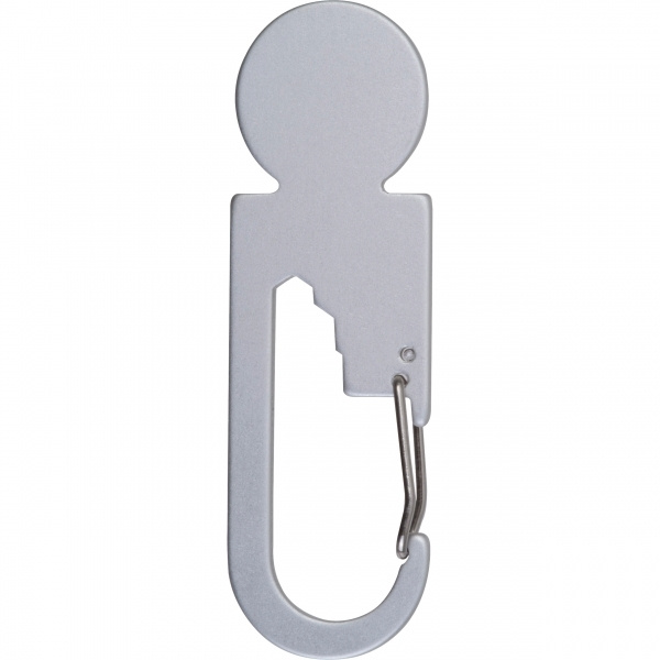 Multitool made of aluminum featuring a shopping cart release, three hex keys in different sizes, and a carabiner. Your logo is applied to the shopping cart release using laser engraving.