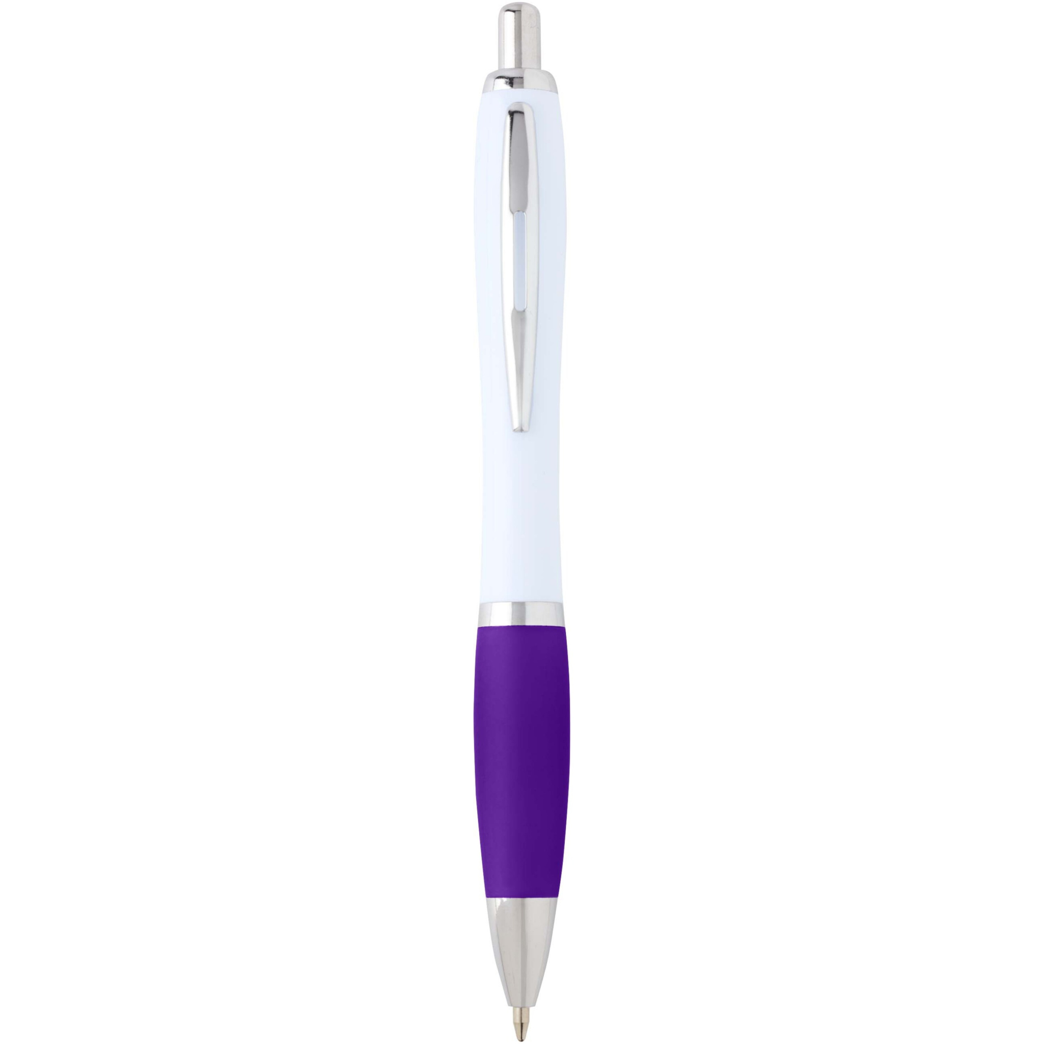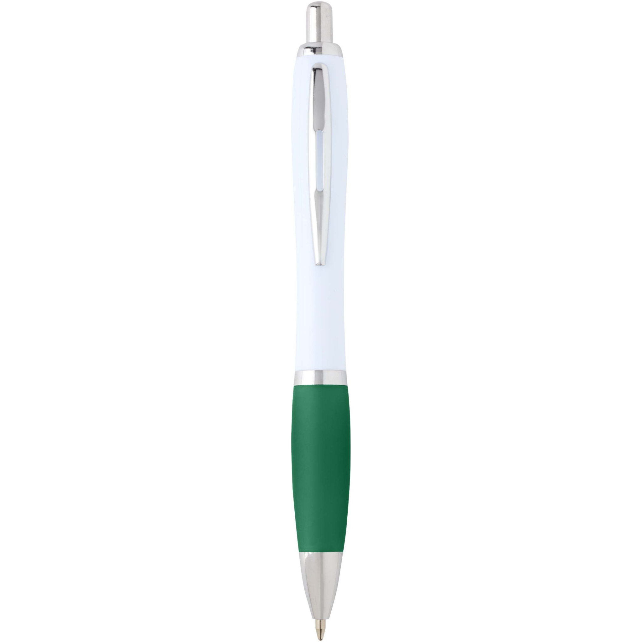 The Nash ballpoint with a stylish curvy design and a soft grip is made of recycled plastic that is hard and solid and thus offers a long life span. Ink colour: Blue. Writing length: 1000 metres. Nib size: 1.00 mm.