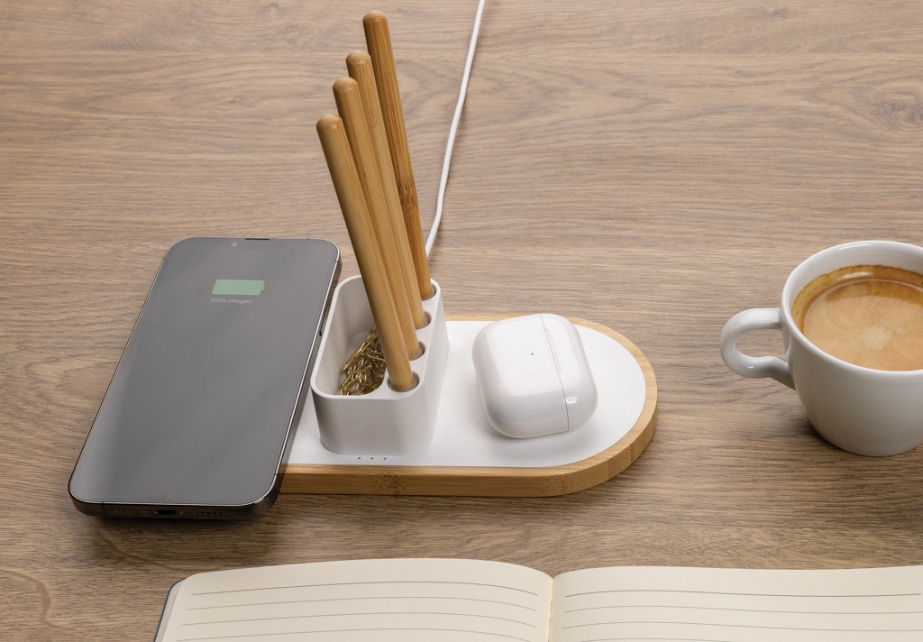 Dual 10W fast wireless charger with pen holder made with RCS (Recycled Claim Standard) certified recycled ABS. Total recycled content: 31% based on total item weight. RCS certification ensures a completely certified supply chain of the recycled materials. The base is made from FSC®100% bamboo. Wireless charging compatible with Android latest generations, iPhone 8 and up. Can charge two phones at the same time or charge any other wireless device. With 4 pen holes for storing pens/pencils and small storage for business card or other small objects. Item and accessories PVC free. Including 120 cm type C charging cable made from RCS certified recycled TPE. Packed in FSC®mix kraft box. Type-C in; Input 5V/2A; 9V/2A; Wireless output 5V/1A;9V/1.1A; (10W) Registered design®