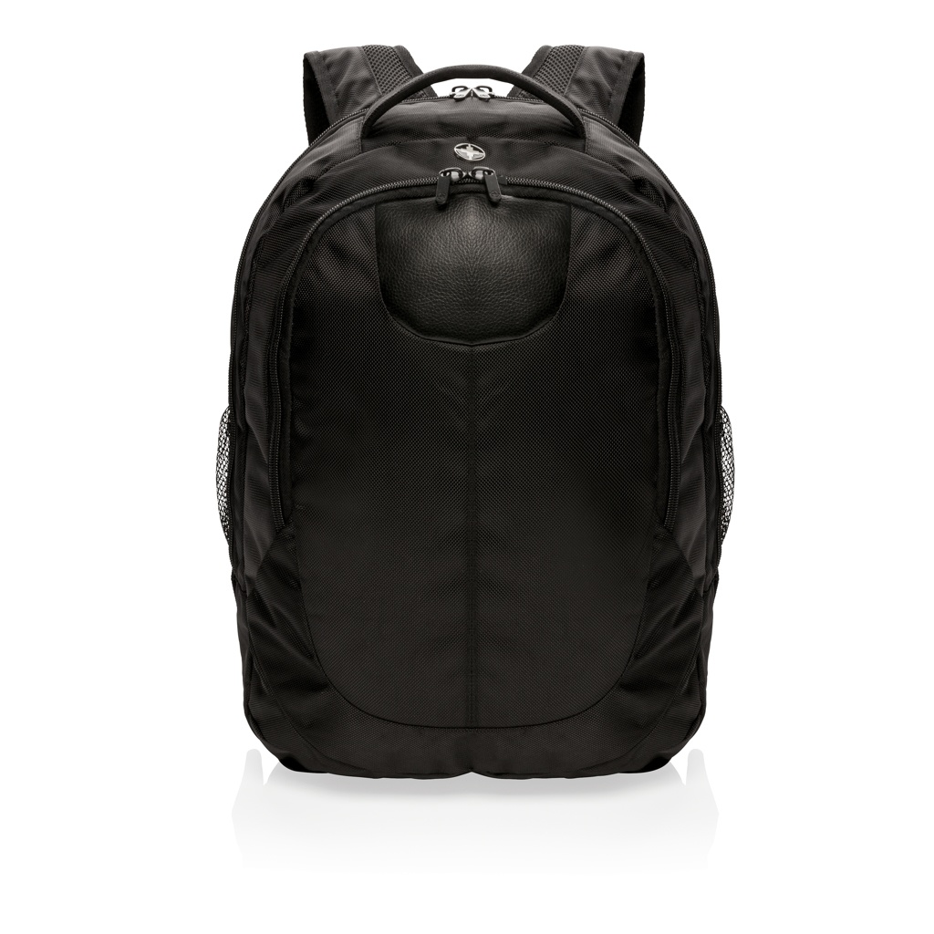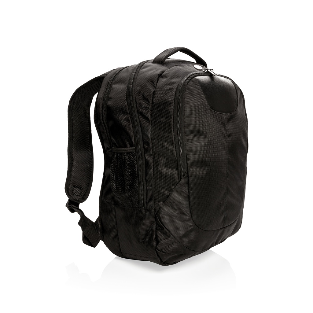 1680D polyester laptop backpack with unique balance between comfort and outdoor protection. The backpack has pockets for all your necessities from padded laptop compartment and iPad holder, to pen loops and mesh pockets. On the shoulder strap there is an audio jack to connect your headphone and a sunglasses carrier. It even has a rain cover to protect it all. Registered®