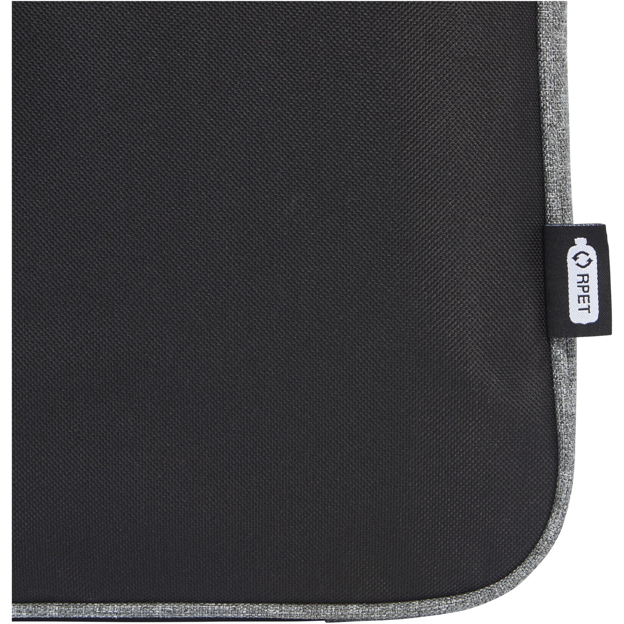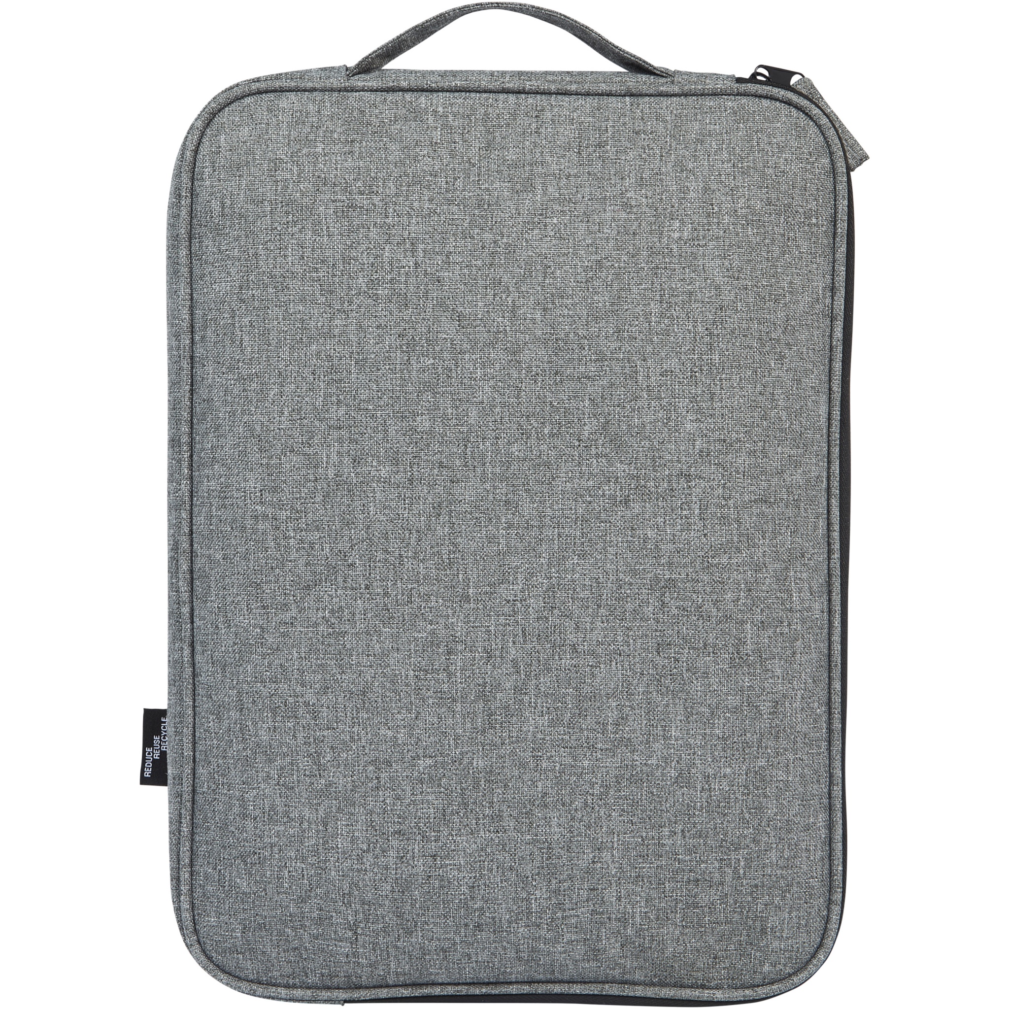 The two-tone laptop sleeve is made from 100% GRS recycled materials on the exterior, and it features a compact and protected laptop compartment fitting most 14" laptops. It also has a zippered front pocket for documents, notebooks and small accessories, and a carrying handle, making it perfect for daily commuting.