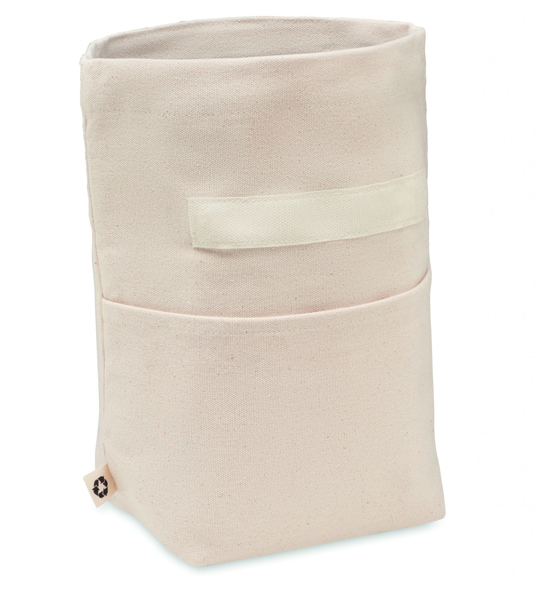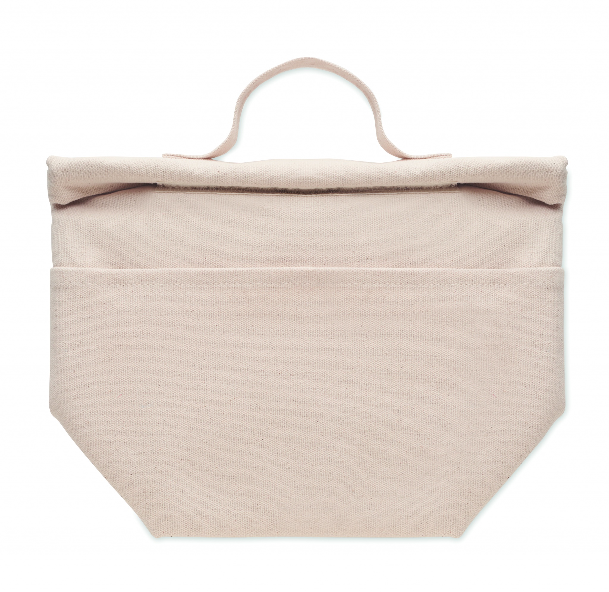 Recycled cotton (70% recycled cotton, 30% recycled polyester) insulated lunch cooler bag with rolltop hook and loop closure. Insulation: 3mm PE foam with 12C PEVA.