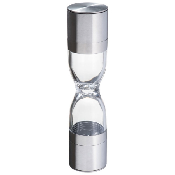 Spice it up! Spice up your customer relationship with this nice 2-in-1 salt and pepper mill. The stainless steel and plastic made mill features two adjsutable ceramic grinders. Rough salt and fresh pepper are easily grinded. We will engrave your logo centered on one stainless steel lid on one side. Single-packed in box.