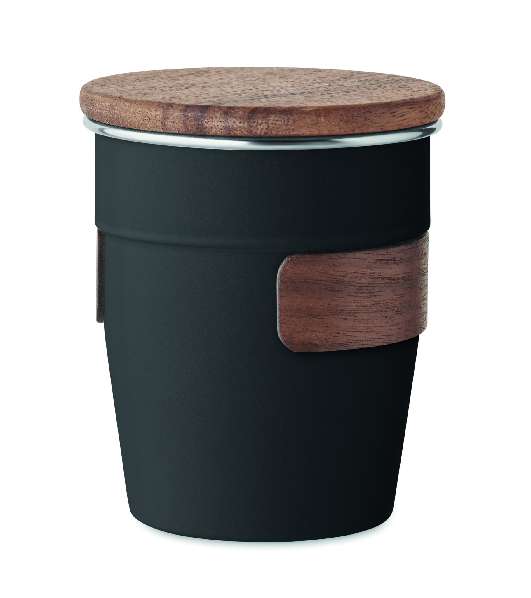 Single wall tumbler in recycled stainless steel (90% recycled stainless steel and 10% stainless steel) with walnut grip and lid. Capacity: 350 ml. Remove grip for cleaning. As this is a single walled mug heat transfer can still occur.