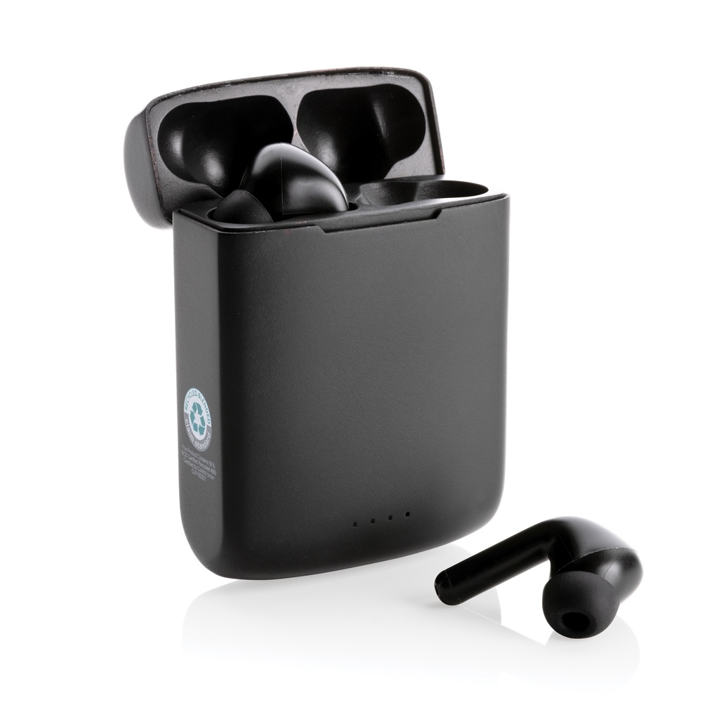 Unique double chargeable wireless earbuds with integrated solar panel in the casing made with RCS certified recycled ABS. Total recycled content: 21% based on total item weight. RCS certification ensures a completely certified supply chain of the recycled materials. The speaker uses high quality monocrystalline solar panels with 19% conversion rate. Charge rate depends on conditions. Charging speed solar: 5V/50mA. The perfectly fitting earbuds have a 35 mAh battery and can be re-charged in the 300 mAh charging case within 2 hours. With auto pairing function so easy to pair to your mobile device. Playing time on medium volume up to 5 hours. With BT 5.3 for optimal connection. Operating distance up to 10 metres. With pick up and mic. Including 3 size silicone ear tips abd RCS certified recycled TPE charging cable. Packed in FSC® mix kraft packaging. Item and accessories 100% PVC free.