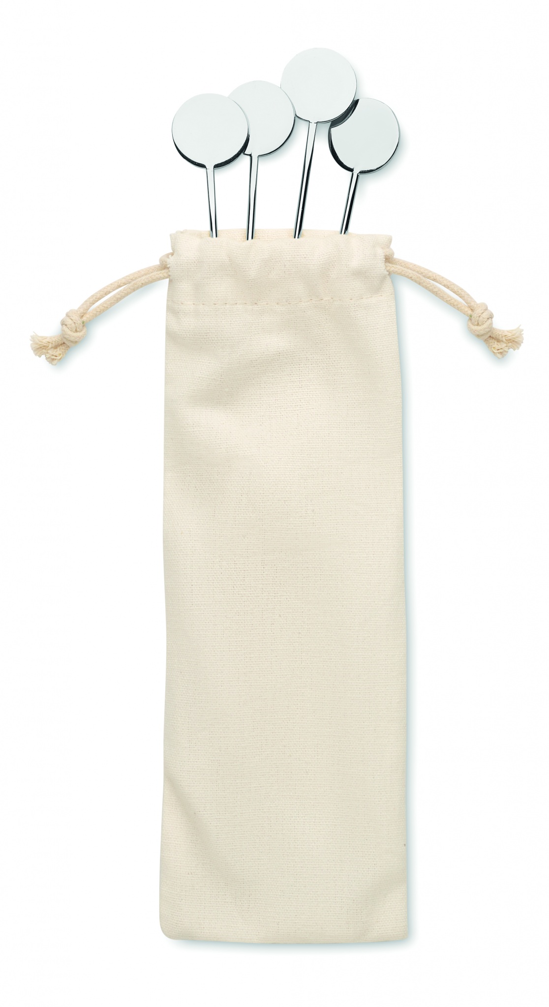 Set of 4 stainless steel drink stirrers in a cotton drawcord pouch.