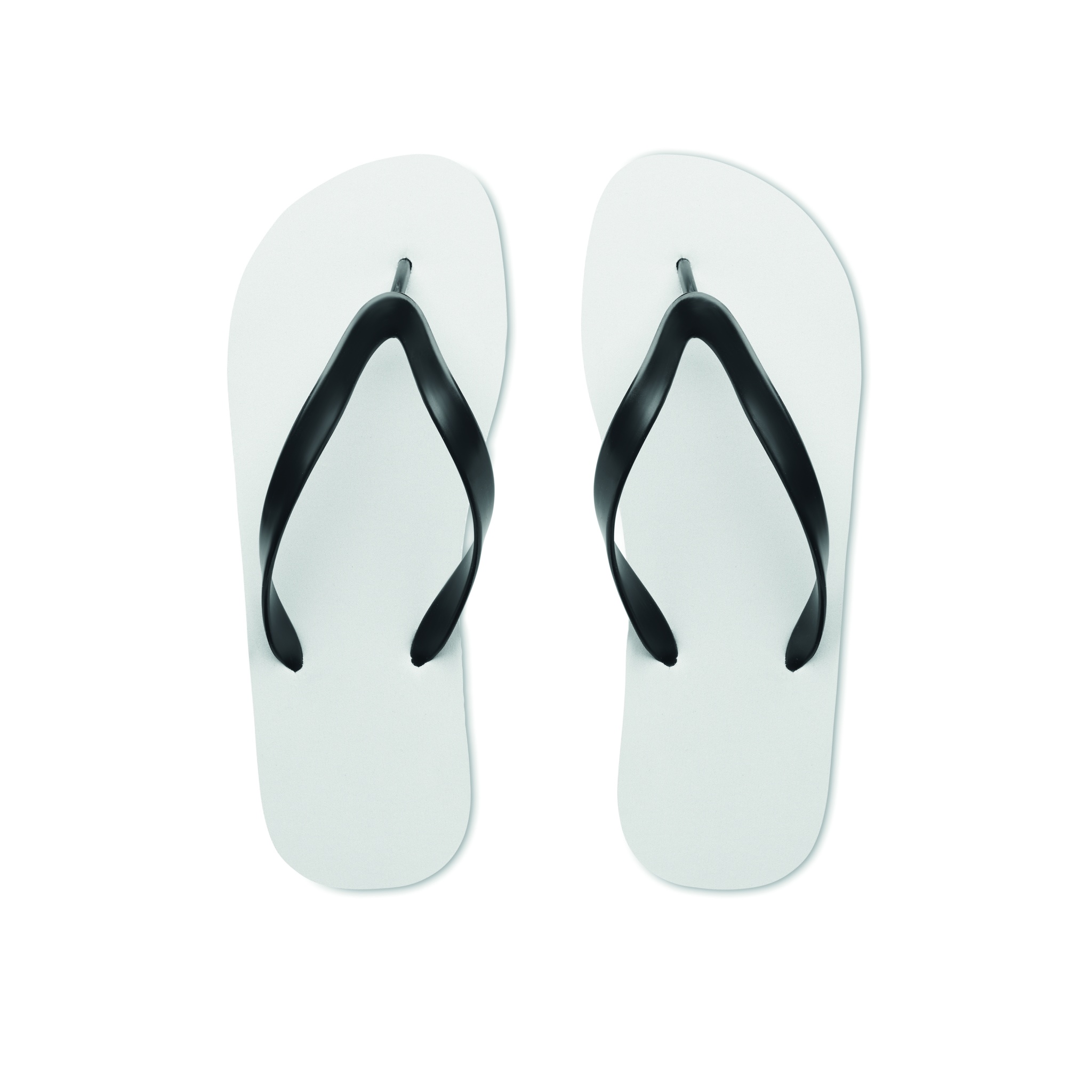 Sublimation beach slippers with PVC straps. Sole made of rubber with polyester top cloth. Size 42-44. Item can only be ordered printed.
