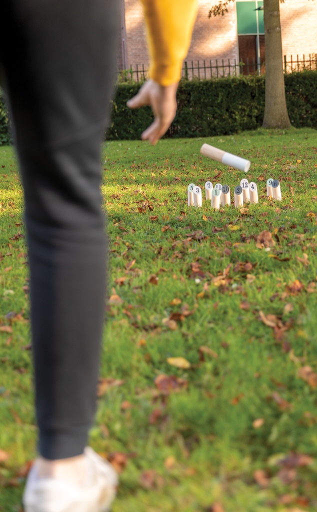 This addictive tactical game challenges players to throw underhand the wooden cylinder at the 12 wooden pins. The first player to reach exactly 50 points wins. It is not allowed to exceed 50. It might look easy but it is highly challenging! After each throw the pins are placed back upright. The set includes: 12 x numbered pins and 1 wooden throwing cylinder all made from strong Pine wood. Presented in a cotton pouch with rule book.