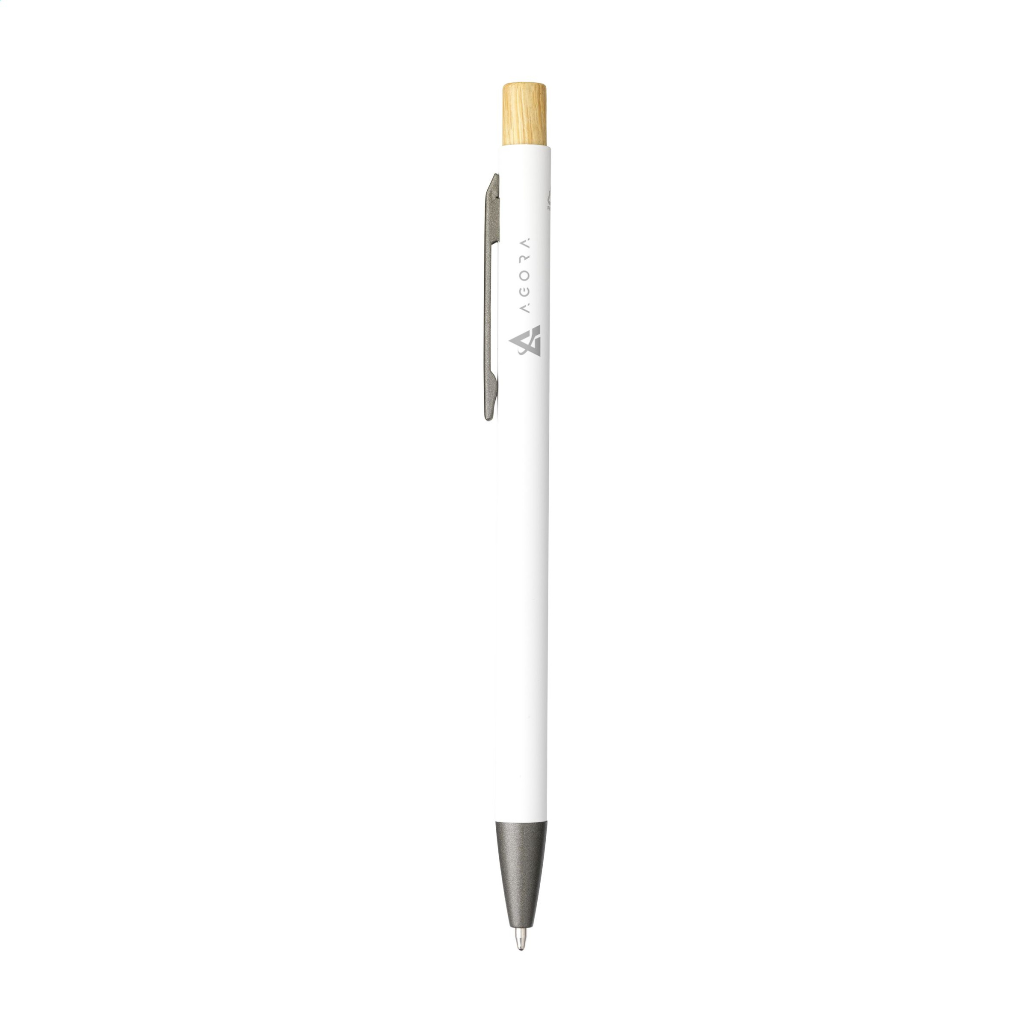 WoW! Blue ink, slim ballpoint pen with barrel made of recycled aluminium with a rubberised finish. Metal clip. Sleek design. The bamboo push button gives the pen a natural touch. GRS-certified. Total recycled material: 78%. The use of recycled aluminium means that fewer new raw materials are used in production. This means less energy consumption and less use of water. A responsible choice.