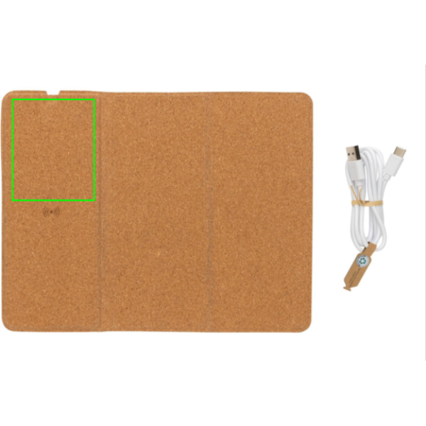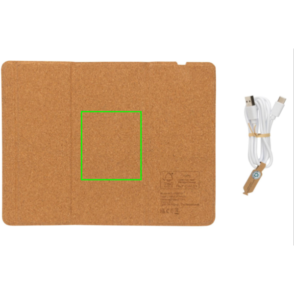 Juhtmeta 10 W laaditav hiirepadi täieliku FSC 100% korgist välispinnaga. Saab kasutada nii hiirematina kui ka telefonialusena. Juhtmeta laadimine ühildub kõigi QI-toega seadmetega, nagu uusima põlvkonna Android, iPhone 8 ja uuemad. Kaasa arvatud 120 cm C-tüüpi laadimiskaabel, mis on valmistatud RCS-sertifikaadiga taaskasutatud TPE-st. Pakitud FSC® mix kraft kinkekarpi. Type-C in; 9V/2A; Juhtmeta väljund 9V/1,1A (10W)