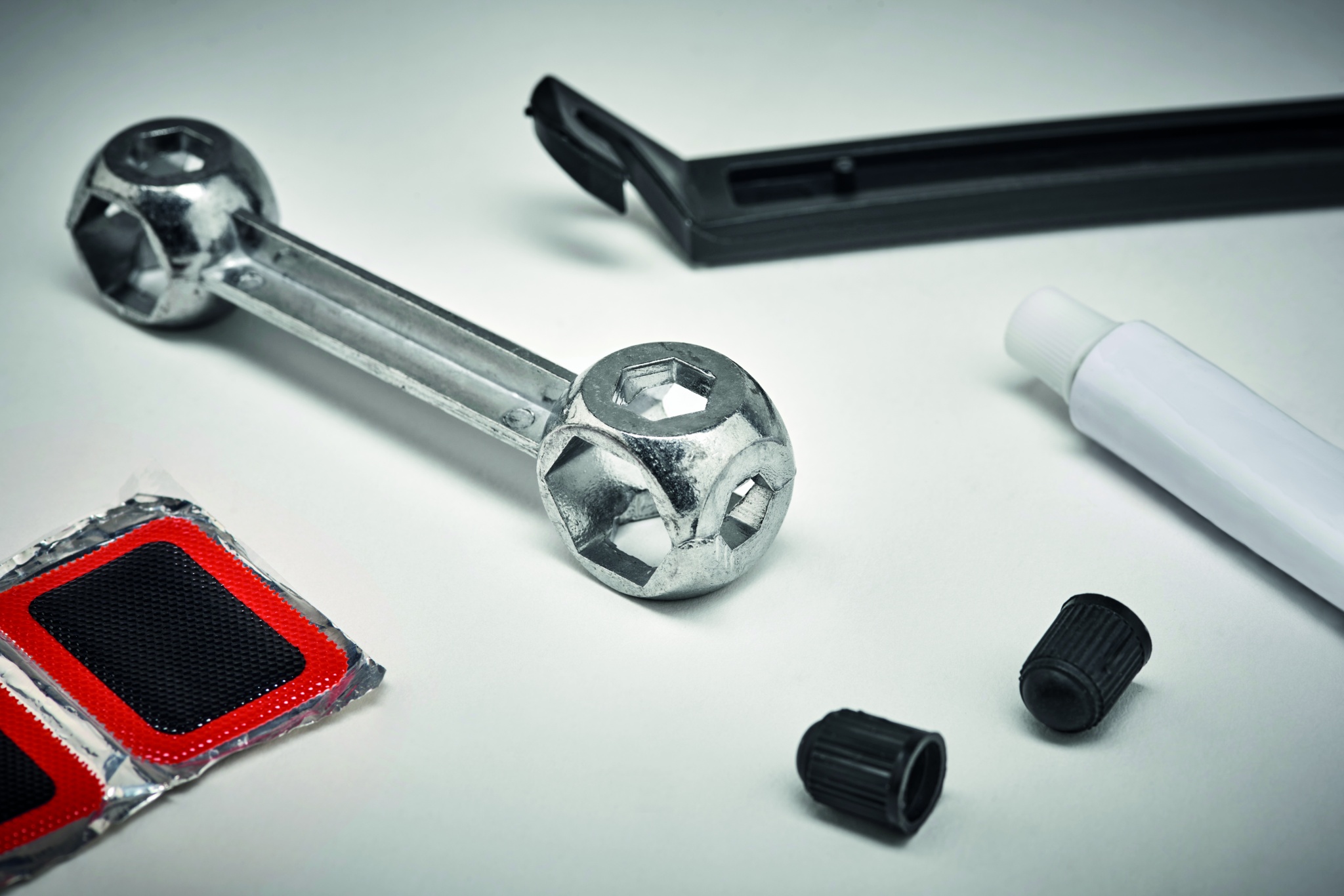 Jalgrattaparanduskomplekt 1 mutrivõtmega, 2 rehvihooba, 1 liim, 2 klapikorki, 2 klapitoru, 1 riiv, 5 parandusplaastrit. Esitatakse läbipaistvas karbis.