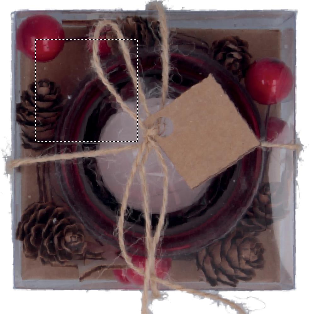 Kaunistustega ümbritsetud klaasist küünlaalus. Esitatakse lindi ja etiketiga papp- ja PVC karbis.
