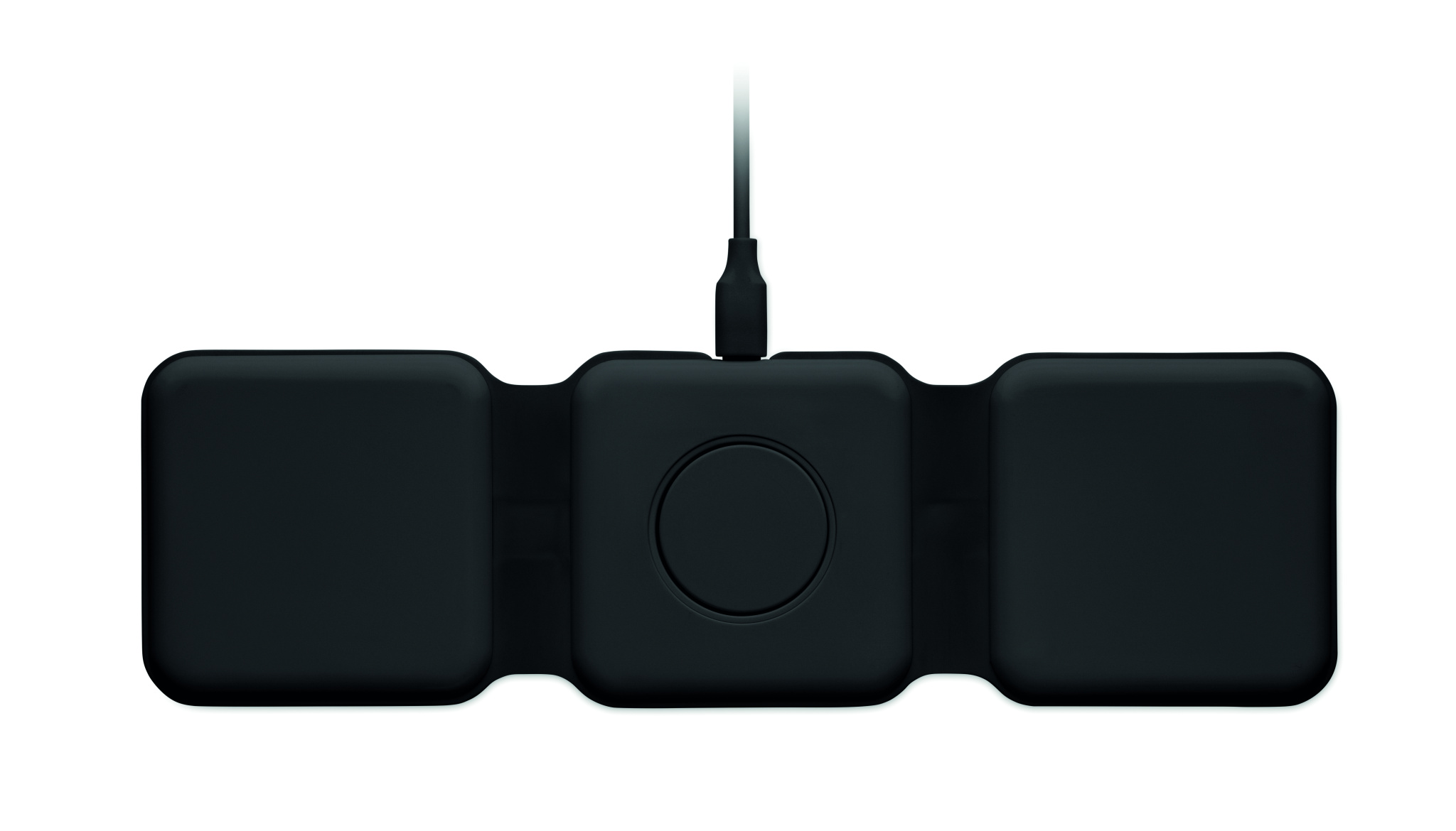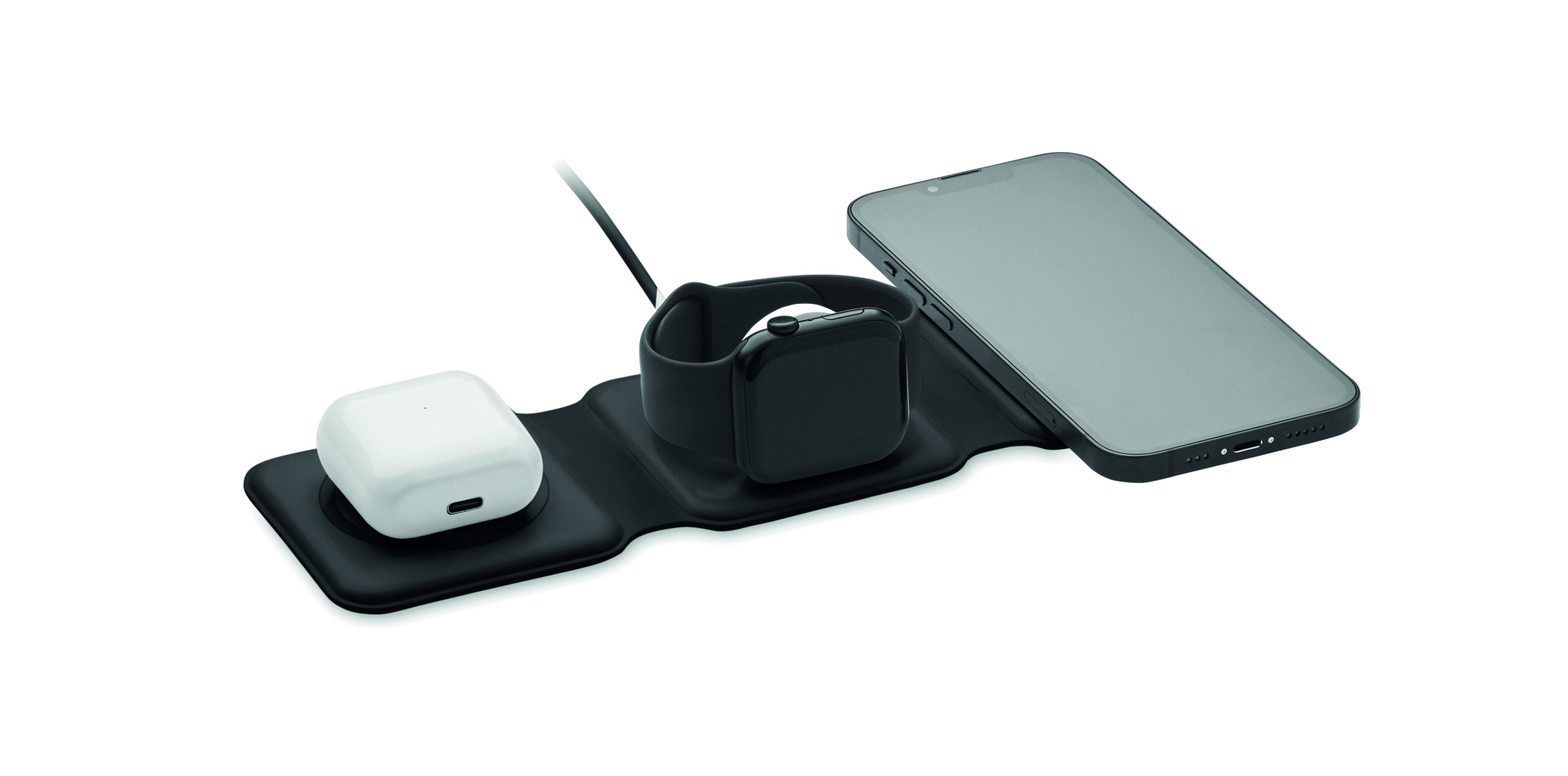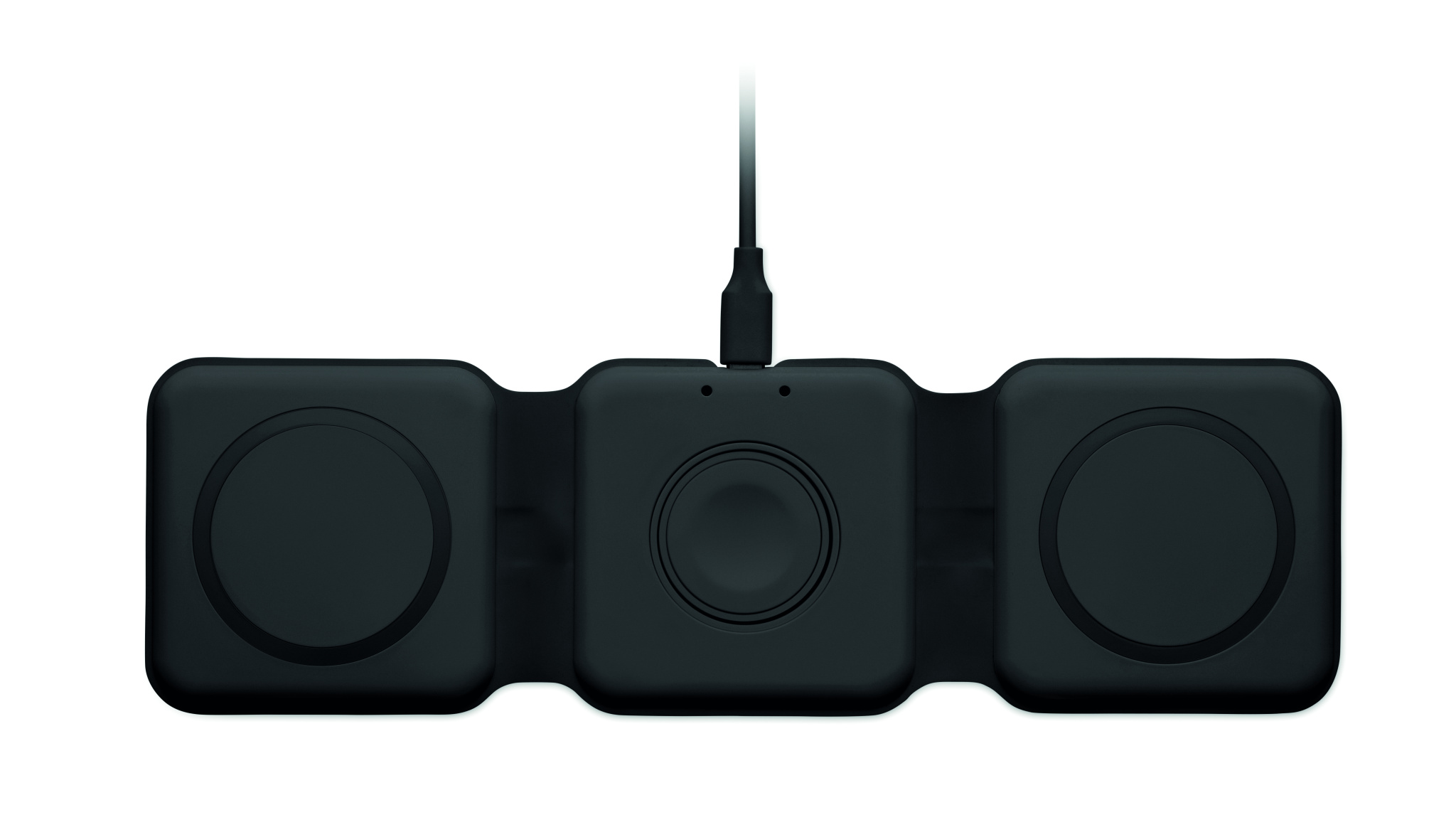 Kolm-ühes kokkupandav ABS-laadimisjaam. Sellel on 3 juhtmevaba laadimiskohta (15 W). Sisend: 2-in-1 Type-C ja Type-A. Ühildub kõigi QI-toega seadmetega, nagu uusimad Androidid, iPhone® 8, X ja uuemad. Ühildub ka iWatchiga.