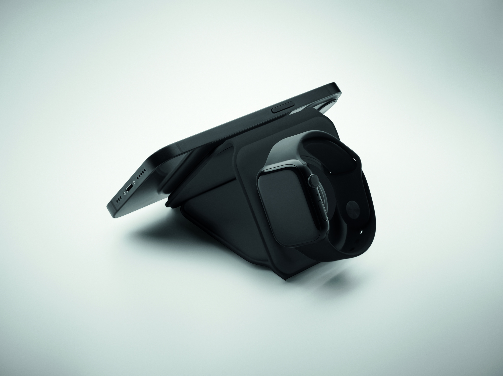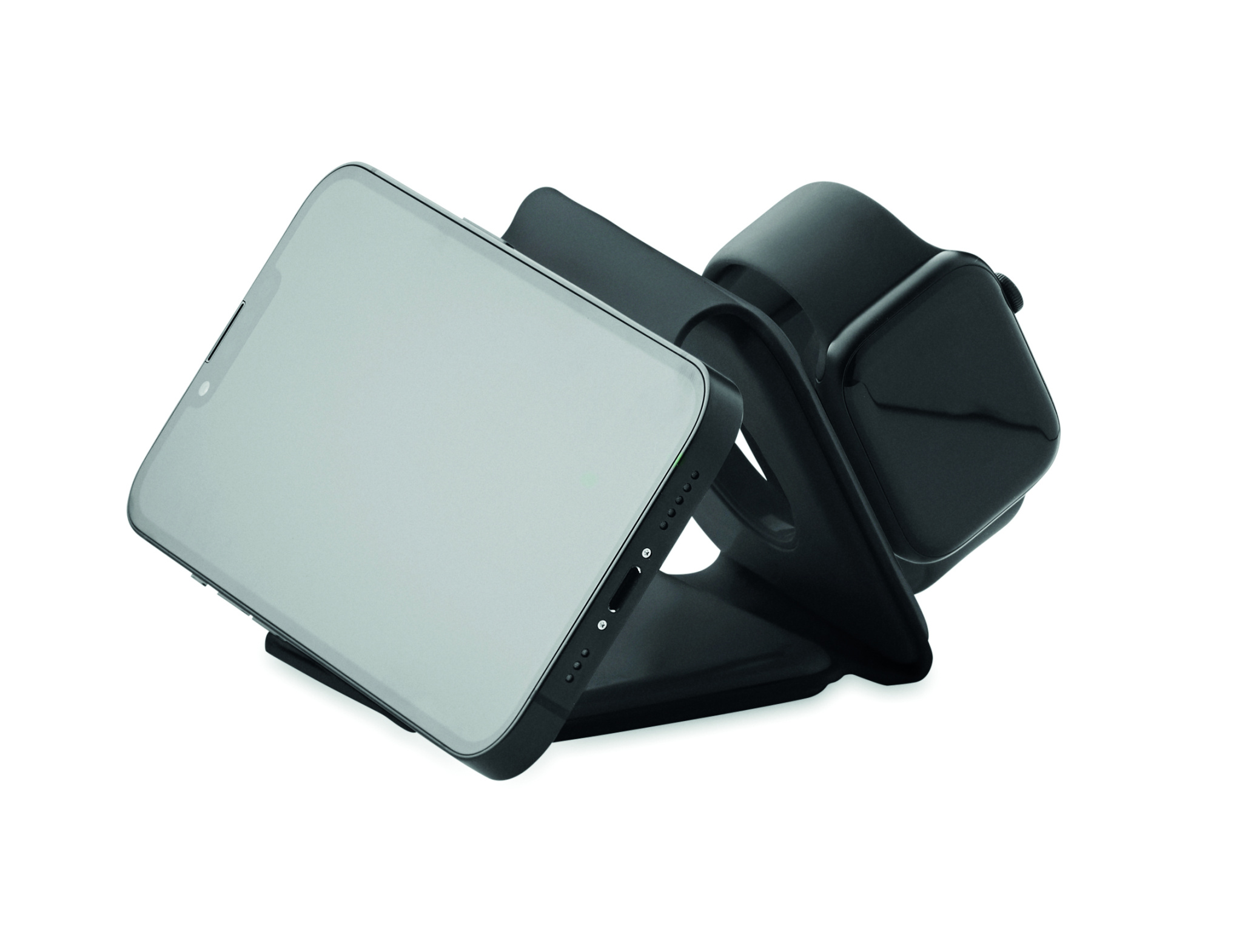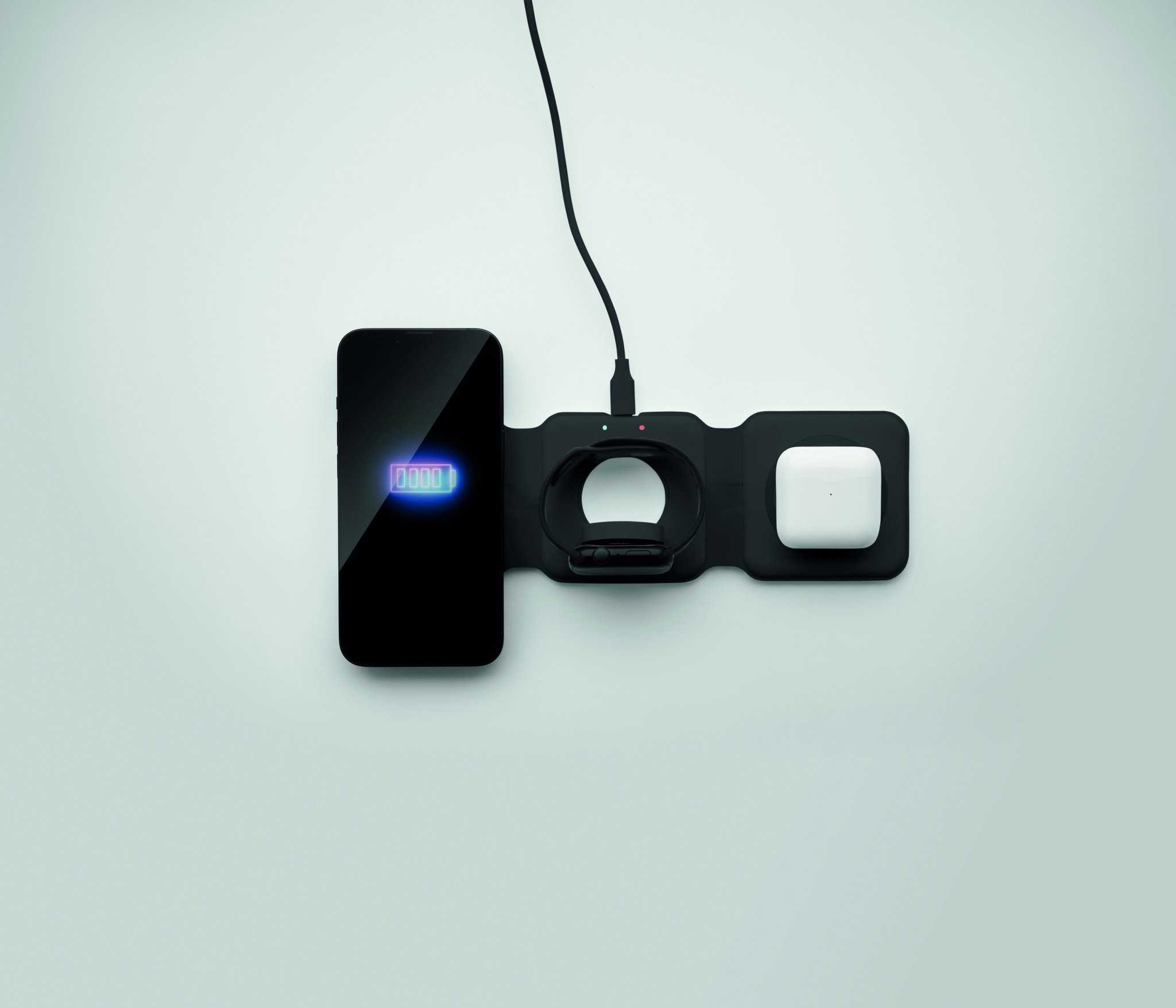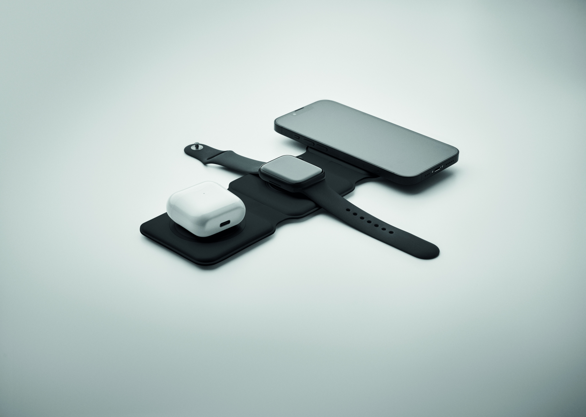 Kolm-ühes kokkupandav ABS-laadimisjaam. Sellel on 3 juhtmevaba laadimiskohta (15 W). Sisend: 2-in-1 Type-C ja Type-A. Ühildub kõigi QI-toega seadmetega, nagu uusimad Androidid, iPhone® 8, X ja uuemad. Ühildub ka iWatchiga.
